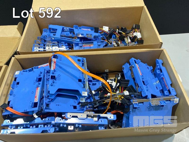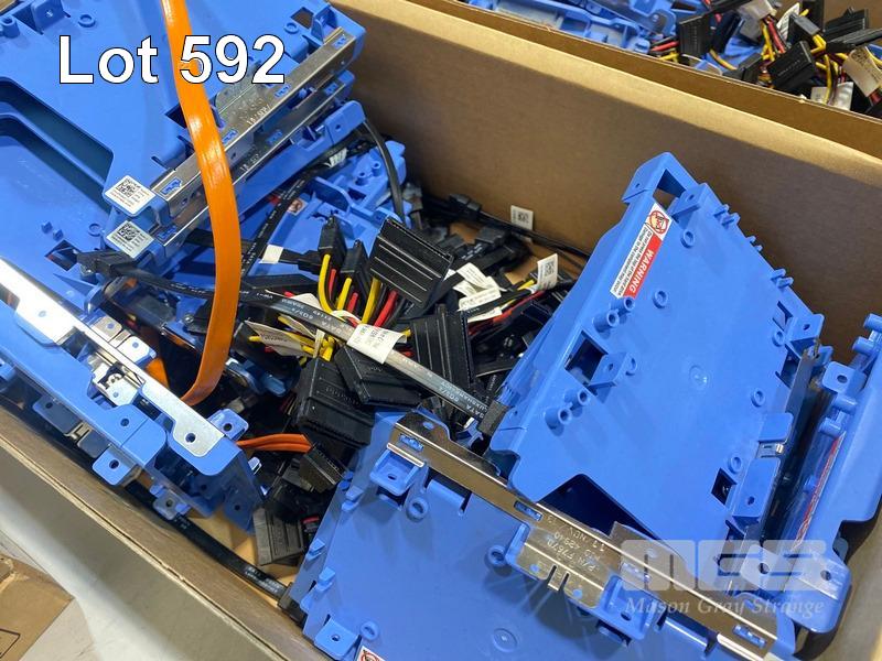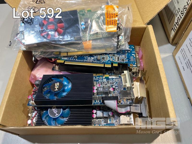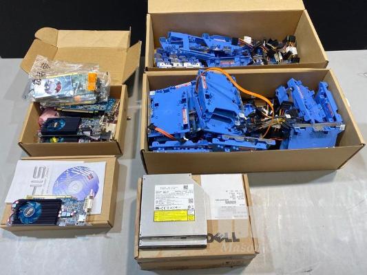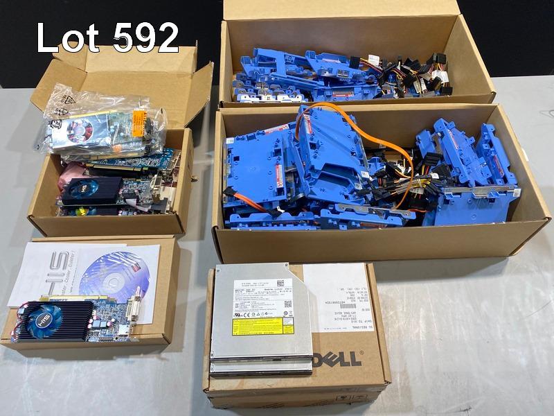 QTY ASST LOW-PROFILE GRAPHICS CARDS, SLIM BLU-RAY DRIVES, DELL HDD CADDIES, SATA CABLES