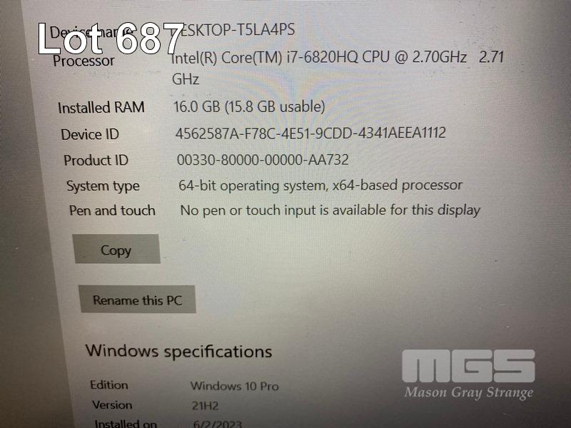 LAPTOP, LENOVO THINKPAD P50 MOBILE WORKSTATION, TYPE 20EQ, CORE i7 6820HQ (6TH GEN) @ 2.7GHz, 16GB DDR4 RAM, 256GB M.2 SSD, 500GB SSD, 15.6" WIDESCREEN (1920x1080), 4GB NVIDIA QUADRO M2000M VIDEO, Wi-Fi, BLUETOOTH, WINDOWS 10 PRO INSTALLED (NO POWER SUPPLY) (NOTE: MARKS ON SCREEN, WHITE SPOT SCREEN BLEMISHES, MISSING "F" KEY, PART RUBBER EDGING MISSING AROUND SCREEN) S/N:PC0DSDE3