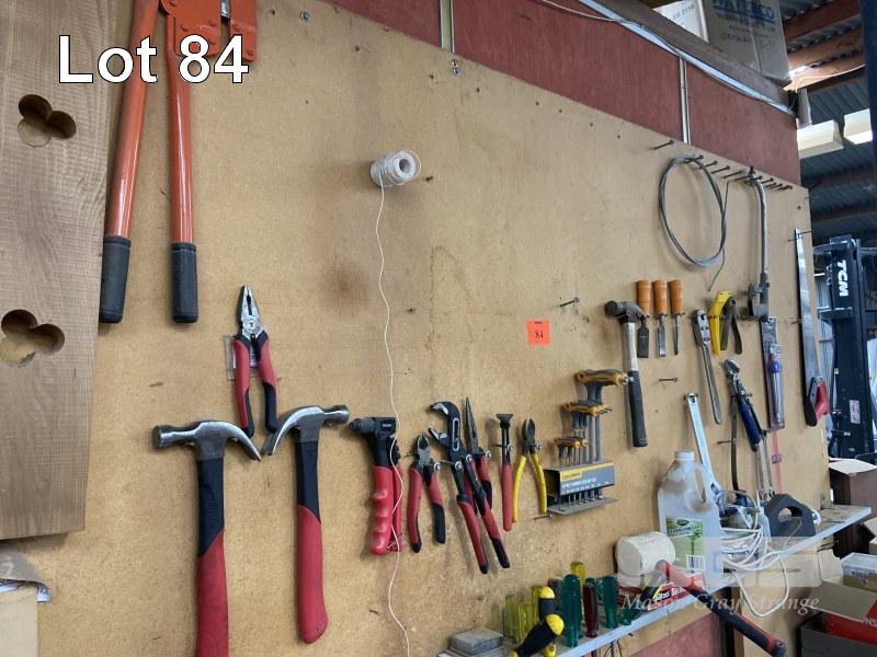 TOOL SHADOW BOARD, TROJAN TOOL SET, HAMMERS, PLIERS, CUTTERS, FIBRO CUTTER, T/BAR SET, ALLEN KEYS, DRIVERS, CHISELS, ETC
