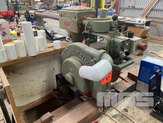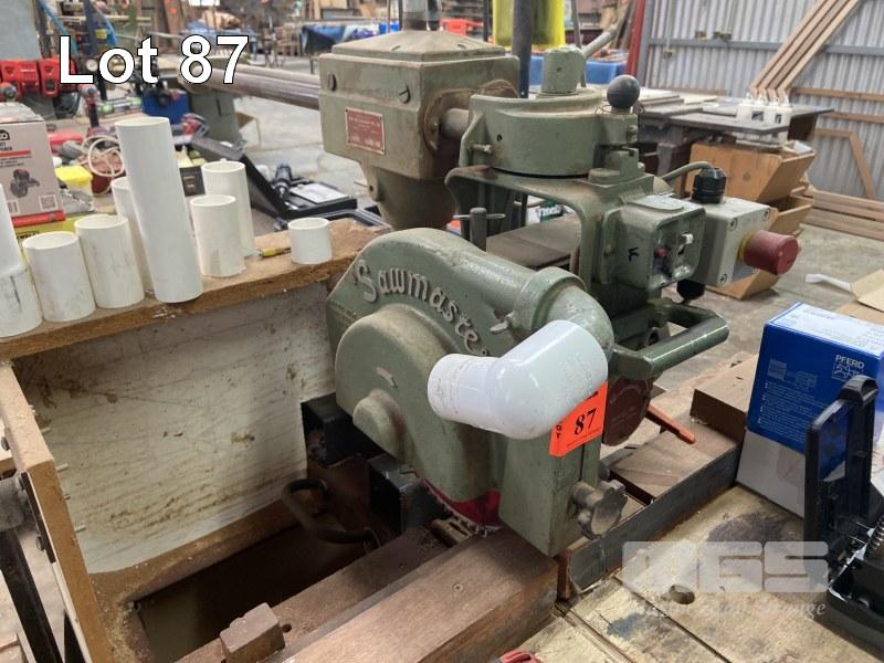 RADIAL DOCKING SAW, SAWMASTER MOD: 785 12" BLADE, SWIVEL HEAD 415V ON BOX STEEL BENCH