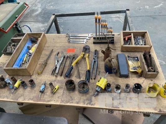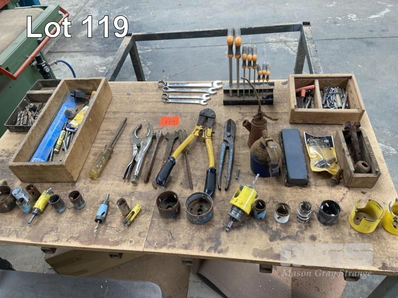 ASSORTED TOOLS, BOLT CUTTERS, SNIPS, T BAR SET, SPANNERS, HOLE SAWS, ETC ON BENCH
