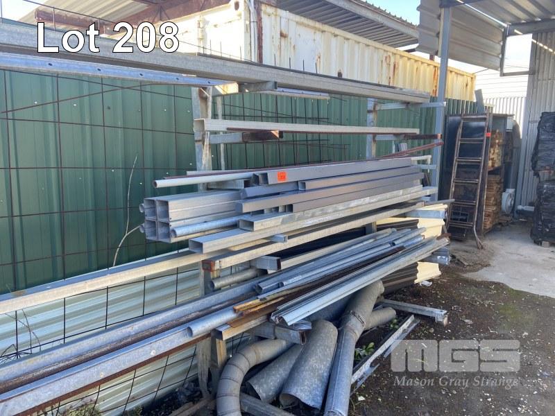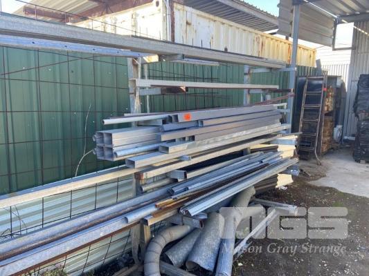4 SECTION STEEL STOCK RACK & ASSORTED STEEL OFFCUT, BOX, TUBE, ANGLE, ETC