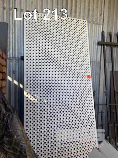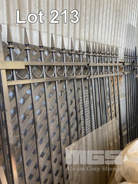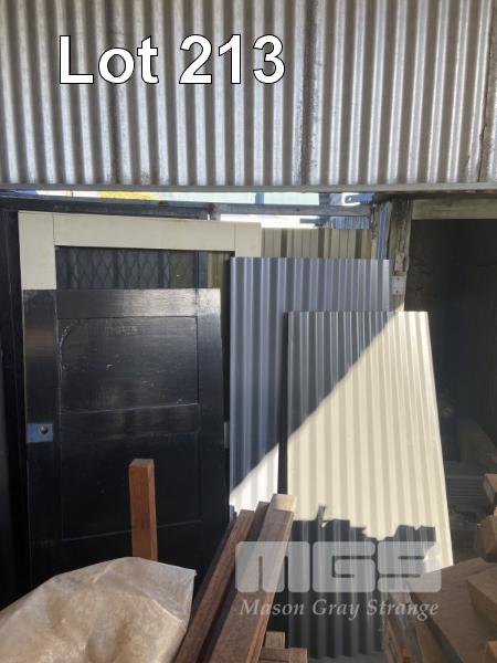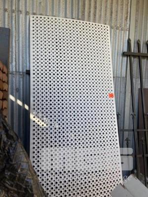 ASSORTED TUBE GATE SECTIONS, PERFORATED STEEL PANEL, OFF WHITE POWDER COATED, LOUVRE, SHEET STEEL, 2 x DOORS, ALSYNITE & COLORBOND IRON ON BACK WALL & SIDE FENCE