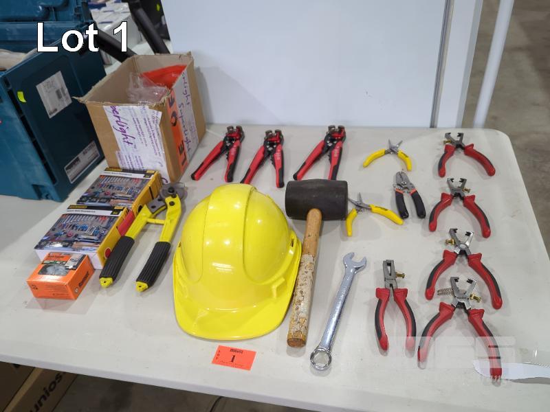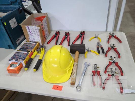 ASSORTED TOOLS & HARDHAT 1 X HEAVY DUTY CABLE CUTTER 300MM 5 X CABAC DOUBLE-V GENERAL WIRE STRIPPERS 2 X DURATECH LONG NOSE PLIERS 1 X HANLONG WIRE STRIPPER/CUTTER 3 X SELF-ADJUSTING WIRE/CABLE STRIPPER/CUTTERS 1 X RUBBER MALLET ALSO ASSORTED HARDWARE AND HEATSHRINK