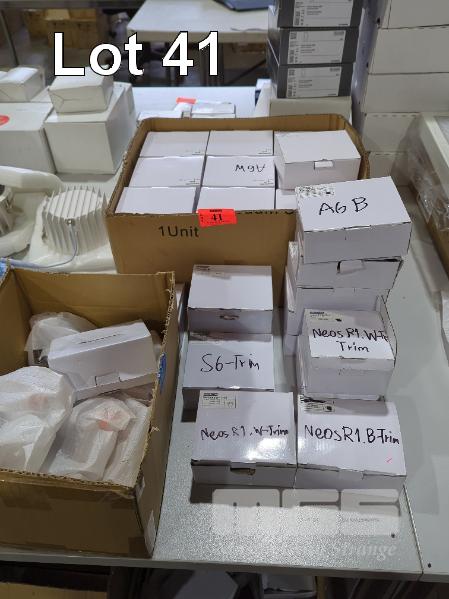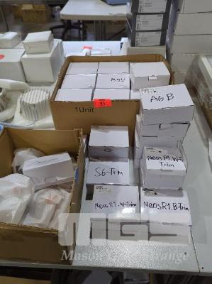 ASSORTED DOWNLIGHT MOUNTING RINGS (PART TABLE AND 3 X CARTONS) 28 X ATMOSPHERE A6W 1 X NEOS S6-TRIM 2 X NEOS A6.W 2 X NEOS A6W-TRIM 1 X NEOS R1.W-TRIM 7 X A6W-TRIM (LOOSE) 5 X 10-PACKS NEOS S6-TRIM (50 ITEMS) 22 (APPROX) X NEOSD1.W-TRIM (USED) 32 (APPROX) X DOMUS CELL FRAME SLOT1 (USED) 5 X NEOSA6B (BLACK) 2 X NEOSR1.B-TRIM (BLACK)