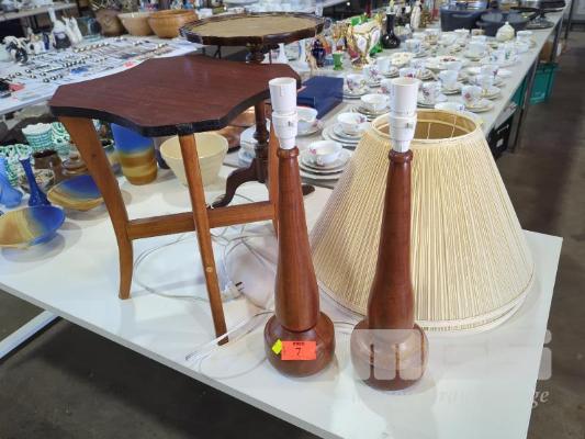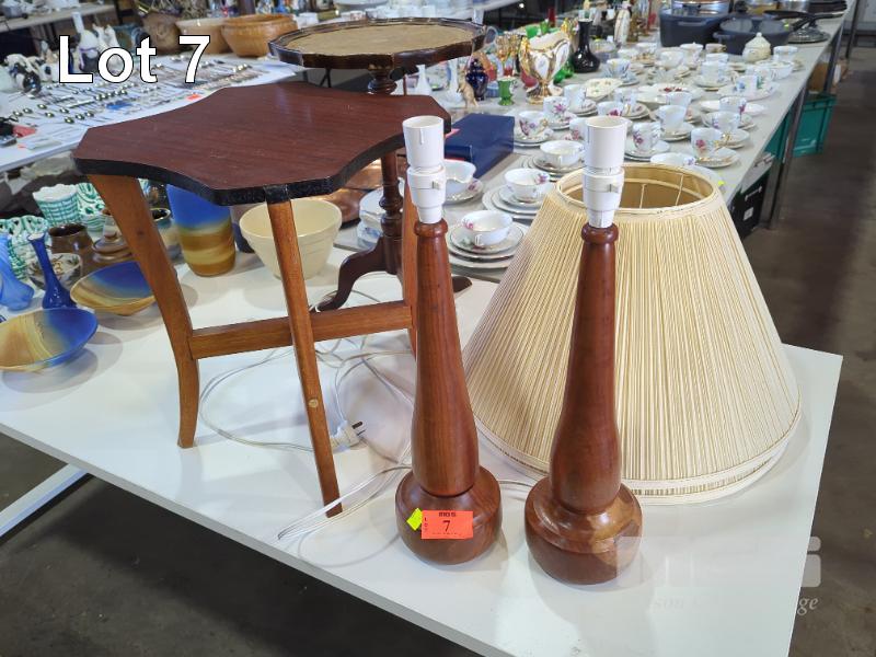 2 X SOLID TURNED HARDWOOD TABLE LAMPS AND 2 X SIDE TABLES.