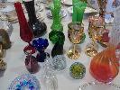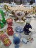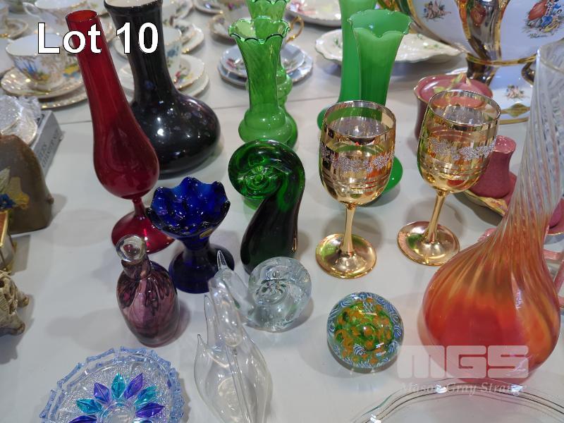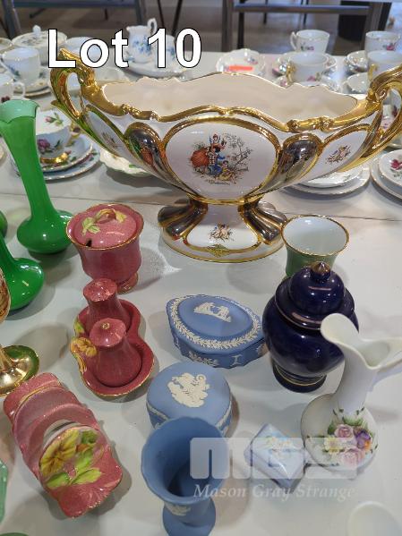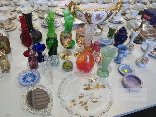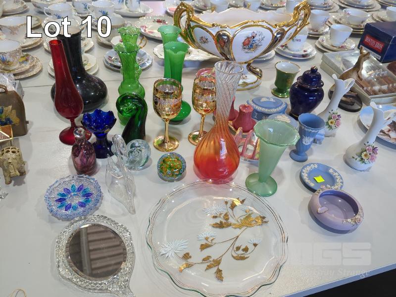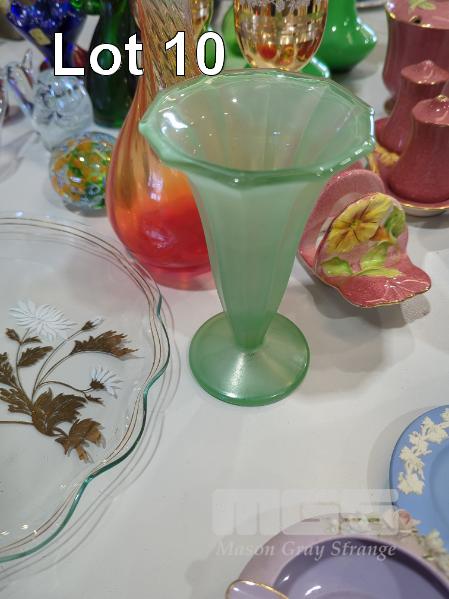 ASSORTED IMPORTED & LOCAL COLLECTABLE CERAMICS AND ART GLASS INCLUDES JASPERWARE AND ANTIQUE RADIUM GLASS VASE.