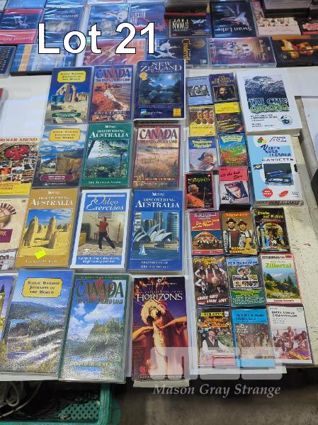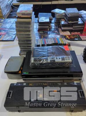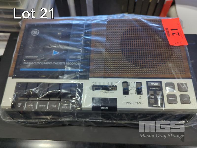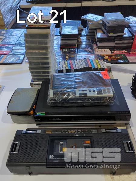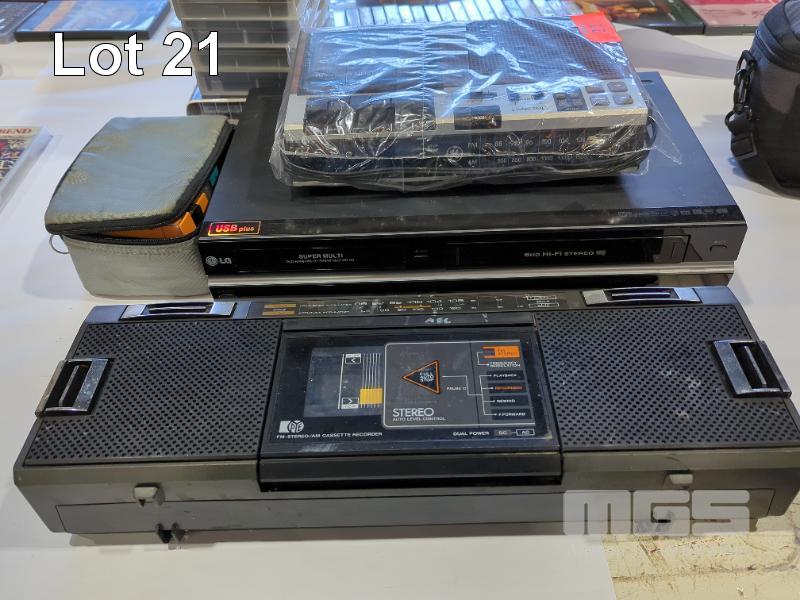 VINTAGE GENERAL ELECTRIC AM/FM PORTABLE RADIO CASSETTE PLAYER, PYE AM/FM PORTABLE RADIO CASSETTE PLAYER, LG DVD RECORDER/VCR WITH REMOTE & CABLES PLUS ASSORTED MUSIC CASSETTES & VHS CASSETTES. (PART TABLE & GREEN TUB. TUB NOT INCLUDED).