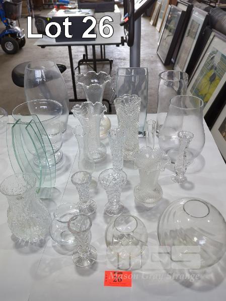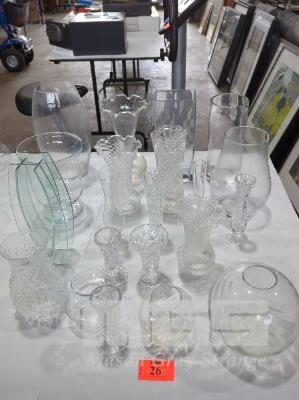 GLASS AND CRYSTAL VASES (PART TABLE 20 X ITEMS APPROX.)