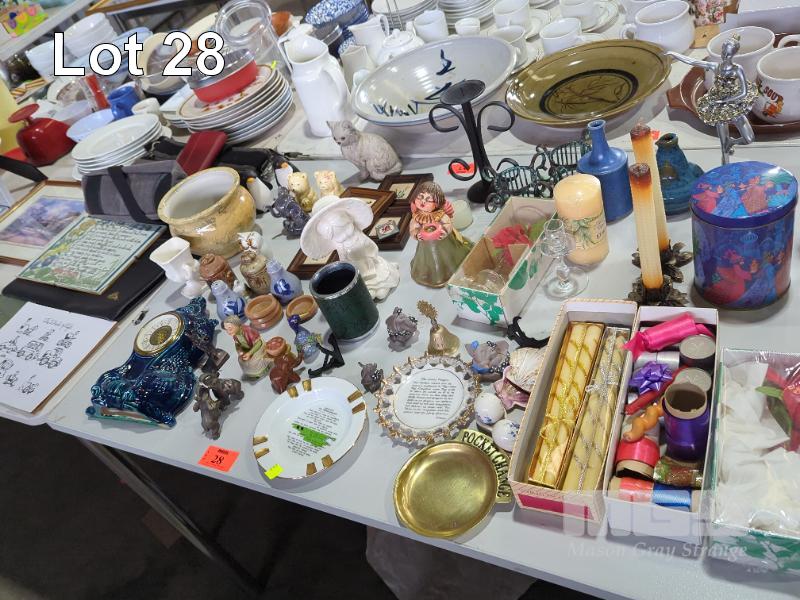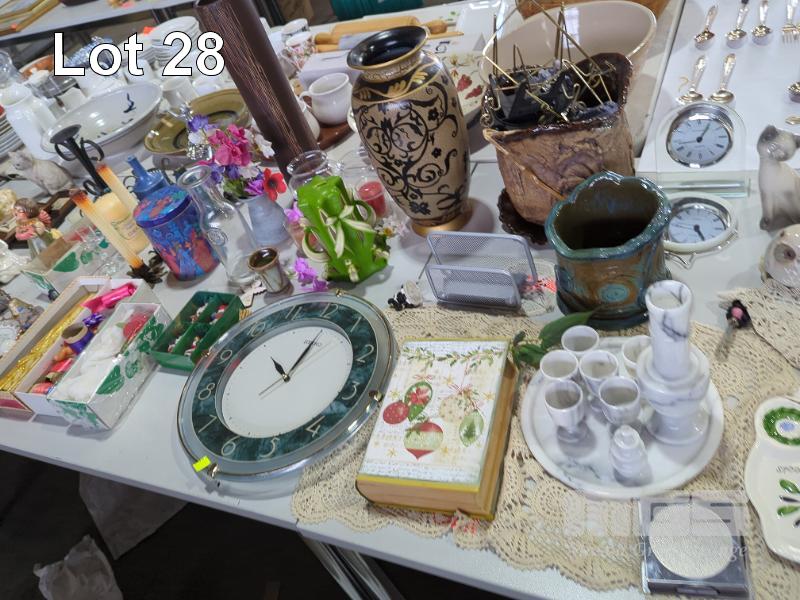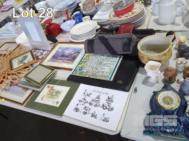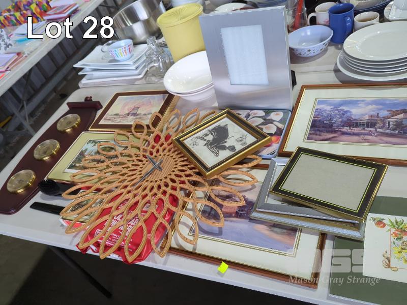 LARGE QUANTITY OF A SORTED HOMEWEARS, ORNAMENTS AND OTHER KNICK-KNACKS, PICTURE FRAMES, CLOCKS, WALL HANGINGS, PLACEMATS ETC. (3 X TABLES)