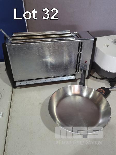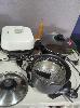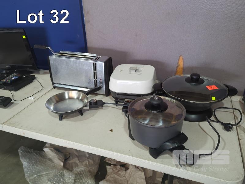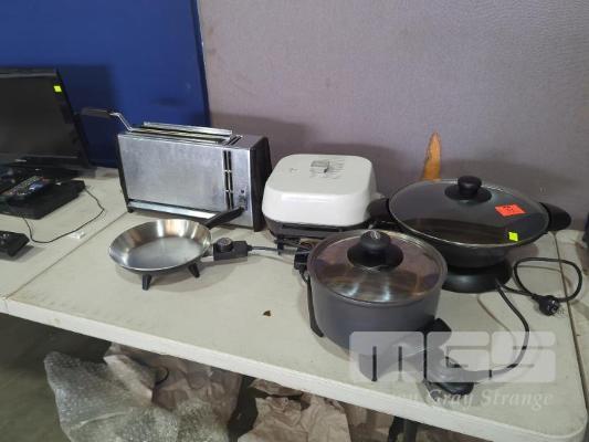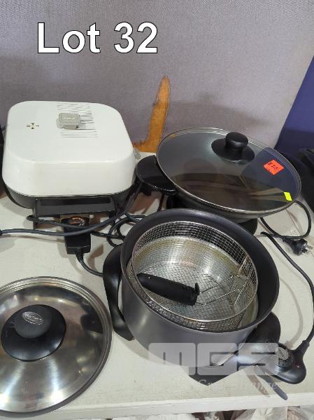 ASSORTED SUNBEAM ELECTRICAL KITCHEN APPLIANCES AND CLASSIC HOTPOINT VERTICAL GRILL. INCLUDES ELECTRIC WOK, FRYING PANS AND DEEP FRYER (1 X TABLE)