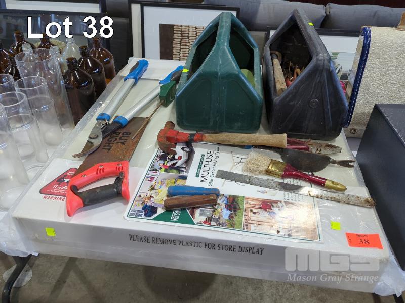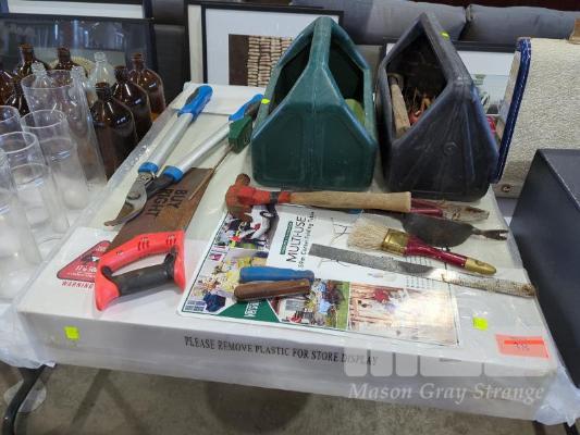2 X TOOL CARRY TRAYS & CONTENTS OF OLD TOOLS AND GARDEN IMPLEMENTS. 1.59M MULTI-USE CENTRE FOLDING TABLE.