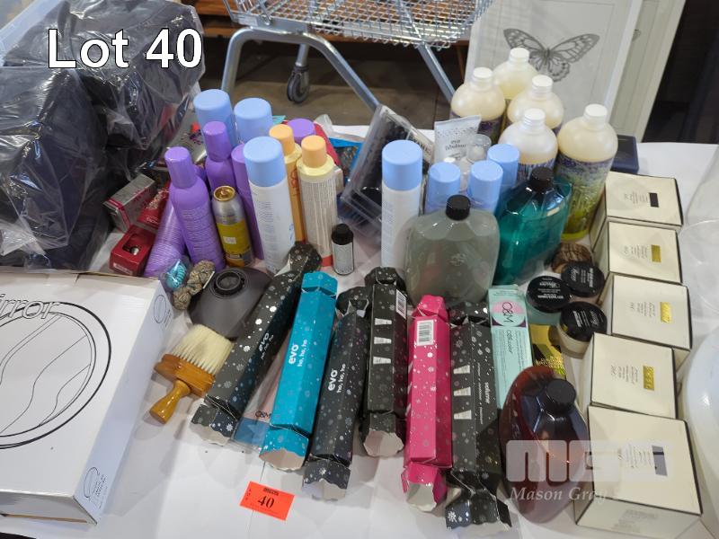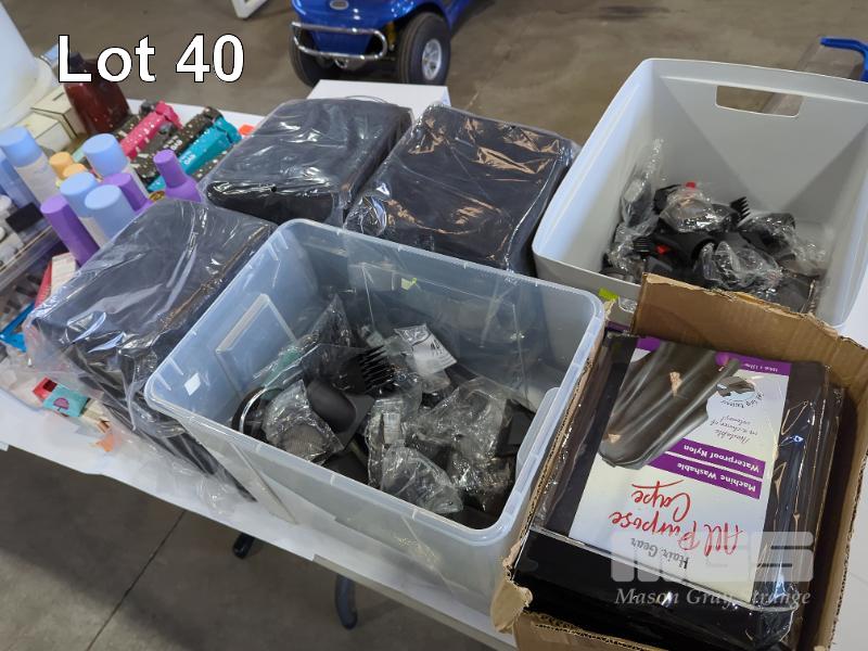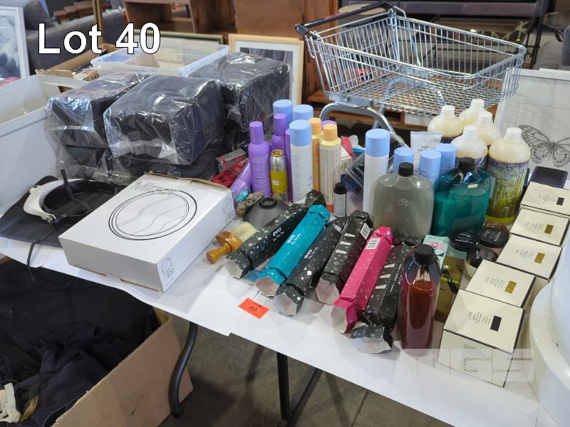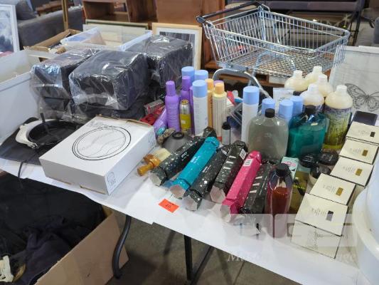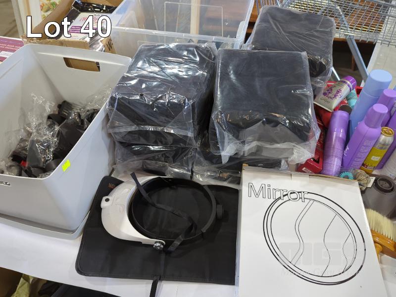 ASSORTED PROFESSIONAL HAIR SALON STOCK AND MISCELLANEOUS. INCLUDES CAPES, COLOURS, HAIR TREATMENTS ETC. (PART TABLE & 2 X CARTONS)