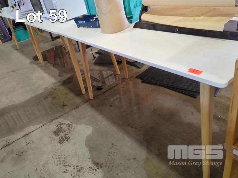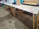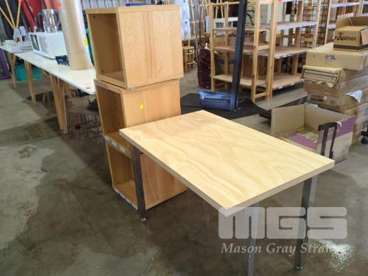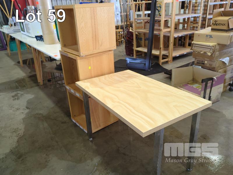 3 X MODERN WORKSTATION TABLES, WHITE LAMINATE TOPS OAK LEGS. 700 X 1500 MM. 3 X WOOD GRAIN LAMINATE DISPLAY CUBES 400 X 400 X 400 MM 1 X SMALL FOLDING LEG TABLE WOOD GRAIN PLY TOP STAINLESS STEEL LEGS 600 X 950 MM. 630 MM HEIGHT.