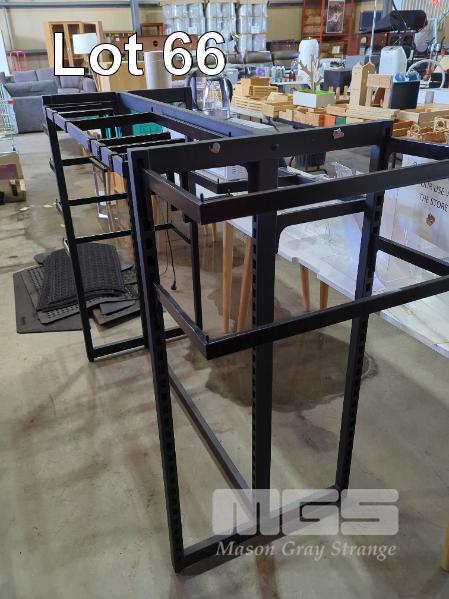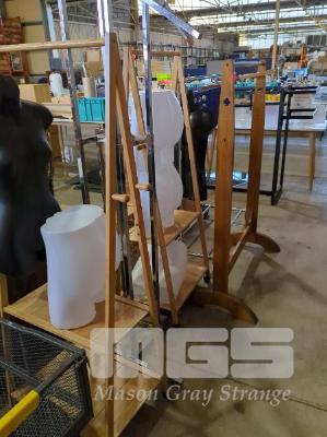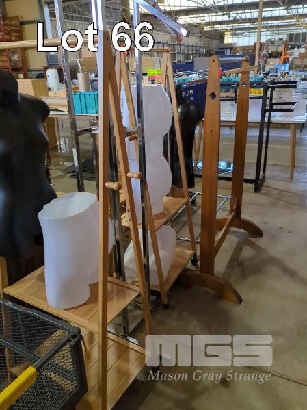 COLLECTION OF RETAIL GARMENT DISPLAY RACKS ETC. "H" GONDOLA IN BLACK 1200 X 600 MM WITH ACCESSORIES, 2 X MOBILE BAMBOO COMBINATION SHELF CLOTHES RACKS, 1 X WOOD FRAME STANDING RACK, 1 X 4-WAY RACK IN METALLIC CHROME, 1 X SINGLE RAIL MOBILE FOLDING RACK. ALSO CLOTHES FOLDER, 4 X HANGING MANNEQUINS TORSOS & 4 X MALE HIP MANNEQUINS