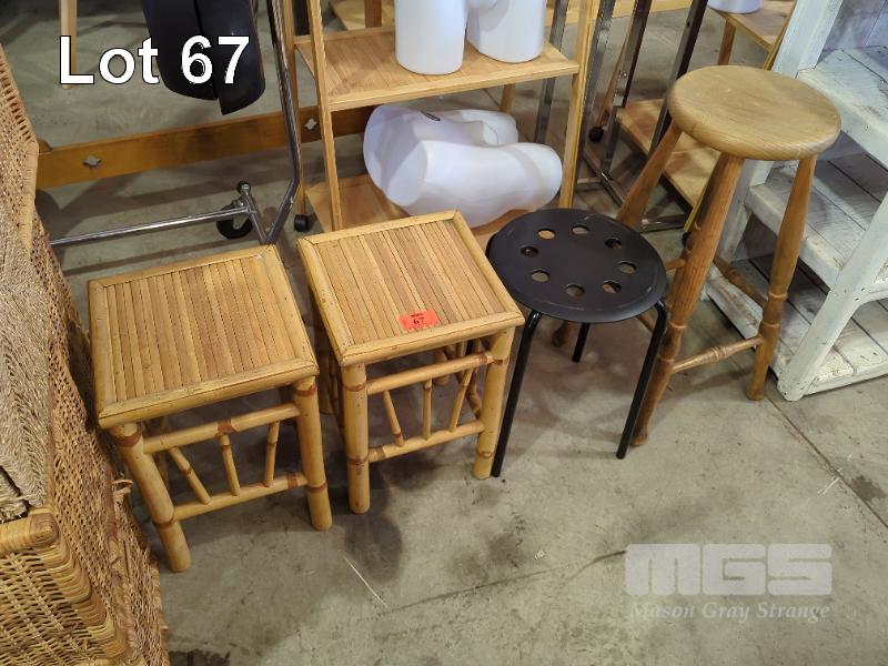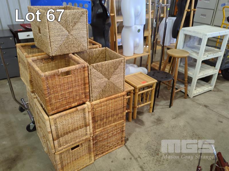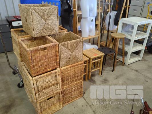 13 X ASSORTED RATTAN & SEAGRASS UTILITY BASKETS. 2 X SMALL BAMBOO SIDE TABLES, 2 X STOOLS AND RUSTIC LIMEWASHED 4-SHELF WOODEN RETAIL DISPLAY SHELF.