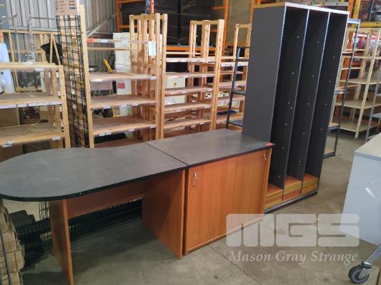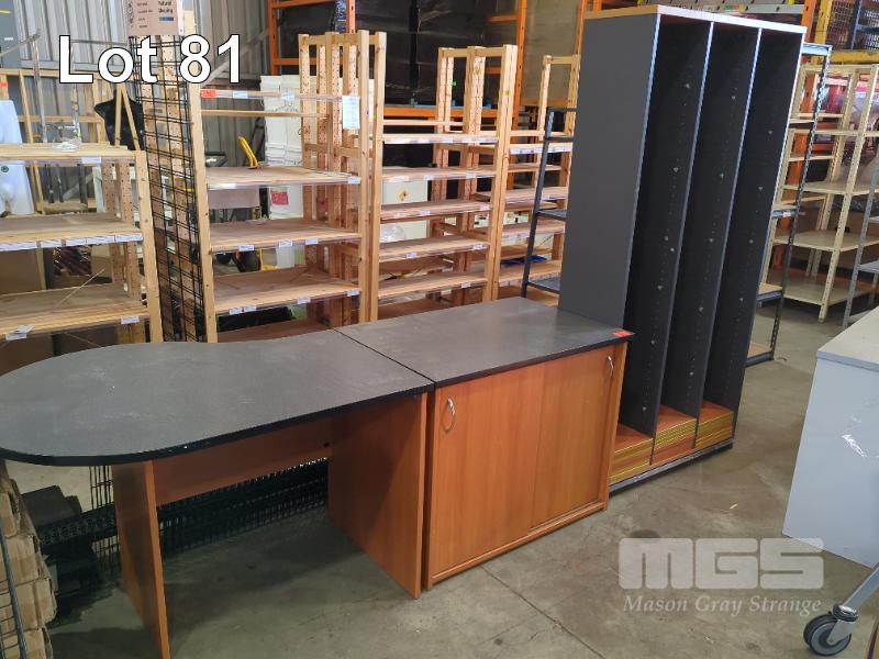 IRONSTONE & BEECH P-END DESK UNIT WITH SLIDING DOOR CREDENZA. AND MATCHING 3-BAY MULTI-SHELF UNIT 900 X 300 X 1800 MM (W D H)