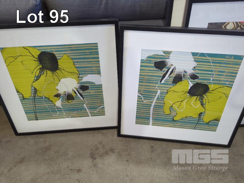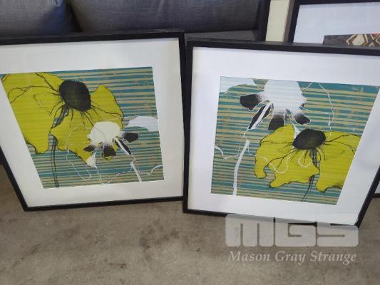 2 X PIECES OF WALL ART. BLACK FRAME. GLAZED. 2 @ 730 X 730 MM - MATCHING SUNFLOWERS.