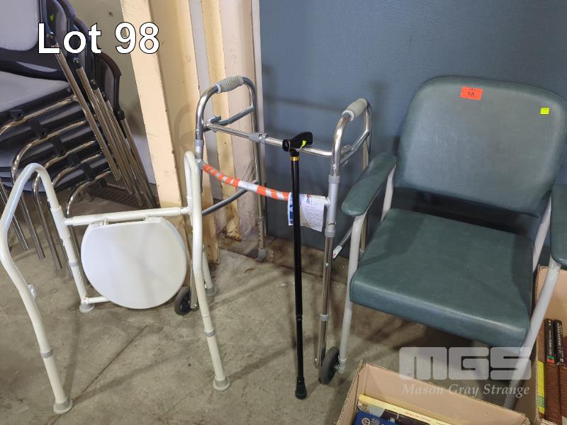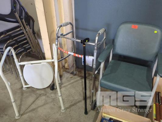 DISABILITY AIDS. ADJUSTABLE HEIGHT MAXI CHAIR. FOLDING WALKING FRAME. ADJUSTABLE HEIGHT WALKING STICK. FOLDING OVER TOILET FRAME.