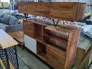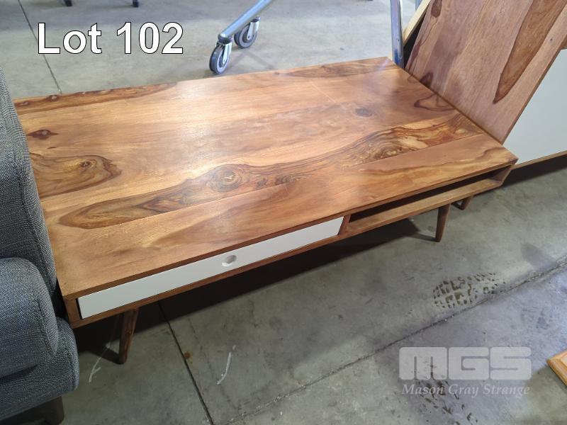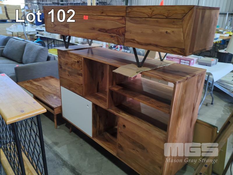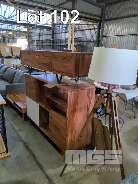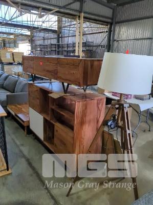 CONTEMPORARY WOOD GRAIN LIVING ROOM SUITE FROM FREEDOM FURNITURE COMPRISING TV UNIT, SIDEBOARD, TRIPOD LAMP AND COFFEE TABLE. INDUSTRIAL STYLE.