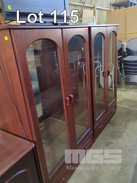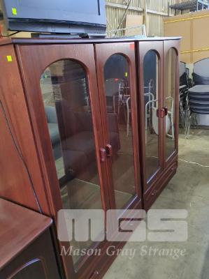 2 X SINGLE DRAWER 2-DOOR DISPLAY CABINETS IN MAHOGANY LOOK. 1 @ 2 X GLASS SHELVES, MIRROR BACKED. 1 @ 2 X WOODEN SHELVES.