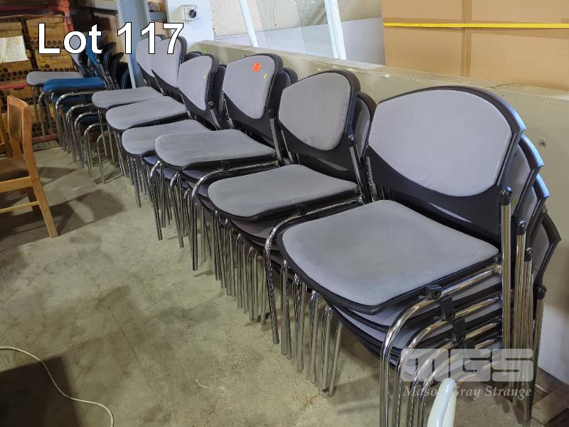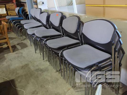 50 X STACKABLE PADDED AUDITORIUM CHAIRS. BLACK PLASTIC BODY, CHROME STEEL LEGS. 45 @ PADDING IN GREY. 5 @ PADDING IN BLUE.