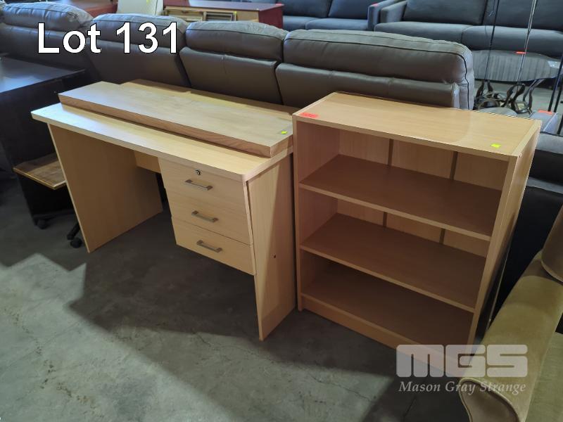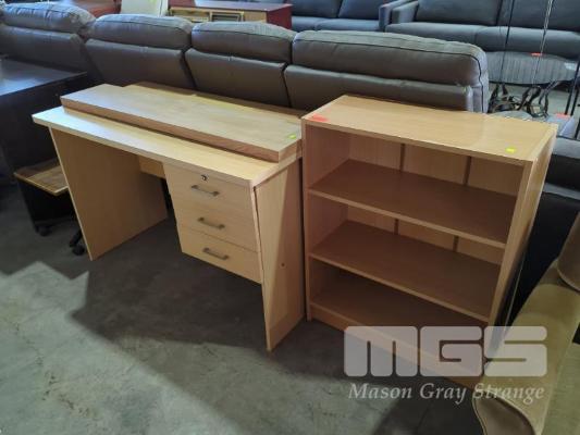 TIMBER LAMINATE 3-DRAWER DESK WITH 3-SHELF BOOKCASE AND FLOATING SHELF.