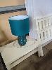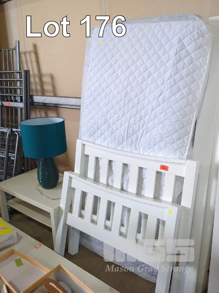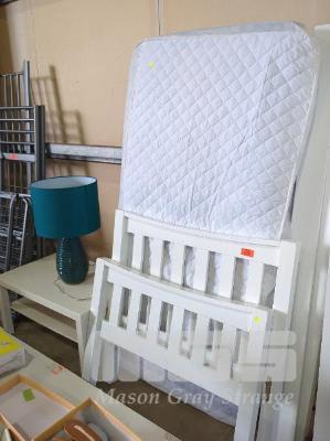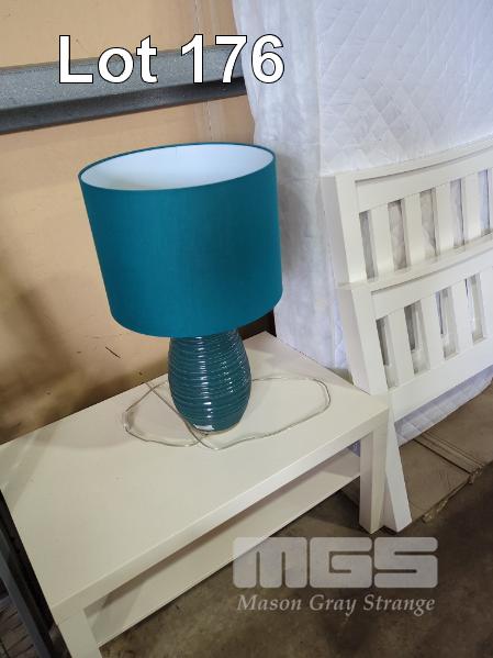 CONTEMPORARY WHITE PAINTED SINGLE BED FRAME AND MATTRESS. GLOSS WHITE CONTEMPORARY MAGAZINE TABLE AND AQUAMARINE CERAMIC TABLE LAMP.