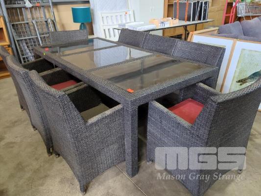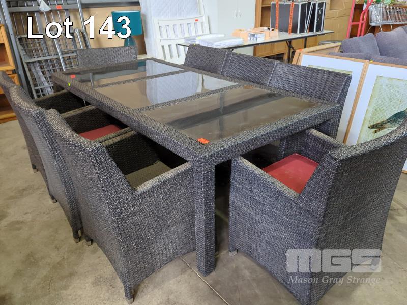 WICKER WEAVE 8-SEAT GLASS PANEL TOP OUTDOOR TABLE, AND 8 X MATCHING ARM CHAIRS, 4 WITH CUSHIONS. UV RESISTANT SYNTHETIC.