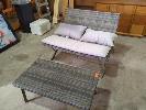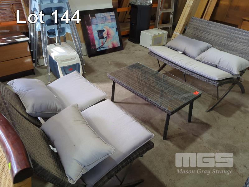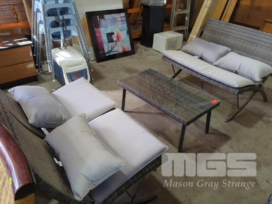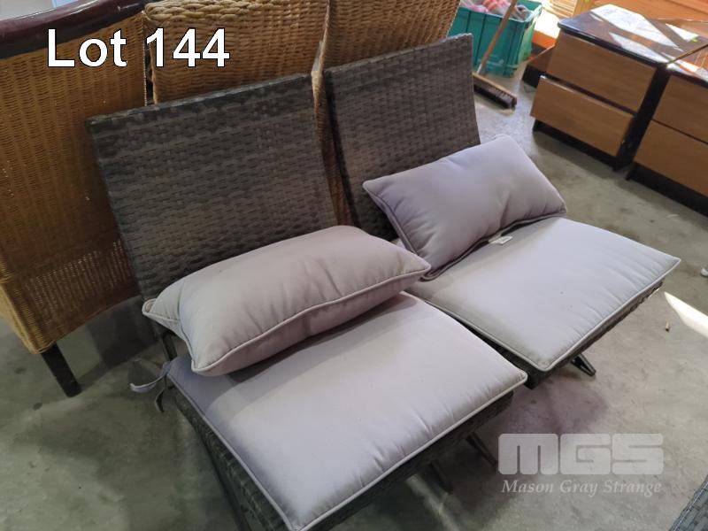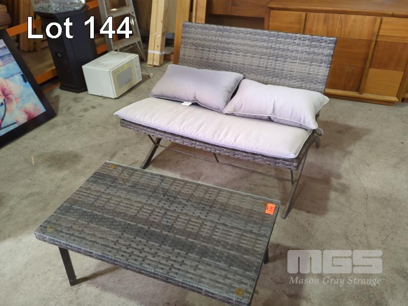 WICKER WEAVE FOLDING CHAIR OUTDOOR SETTING COMPRISING 2 X SINGLE CHAIRS, 1 X DOUBLE CHAIR AND GLASS TOPPED COFFEE TABLE. WITH CUSHIONS. UV RESISTANT SYNTHETIC.