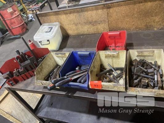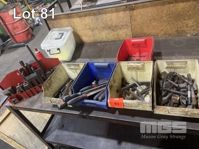 4 TRAYS ASSORTED FILES, HEX KEYS, MILL, CLAMPS & BOLTS, CLAMPING KIT