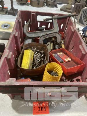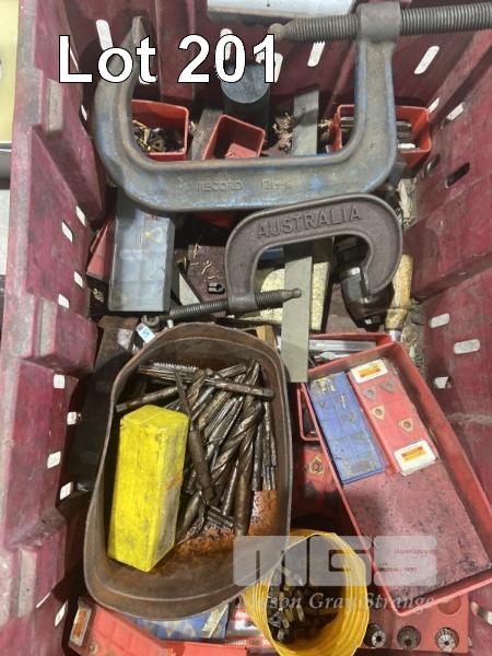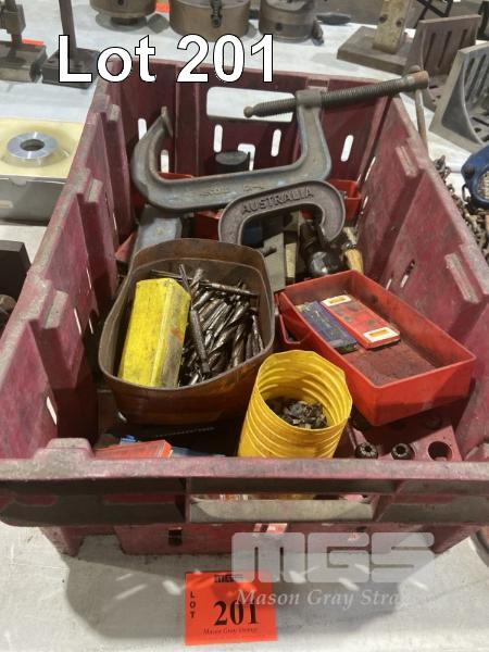 ASSORTED LATHE TOOL TIPS, END MILLS, TAPS, 2 x 'G' CLAMPS, KEYLESS CHUCK, END DRILLS, NUMBER PUNCHES