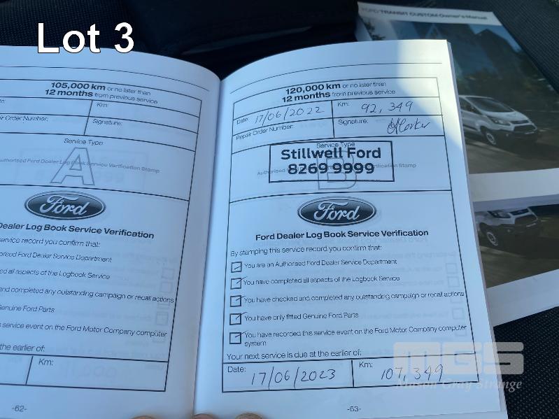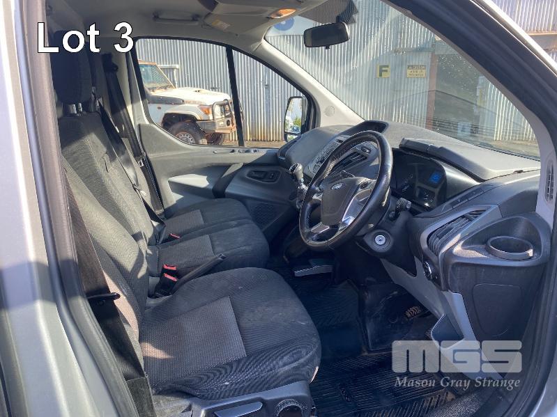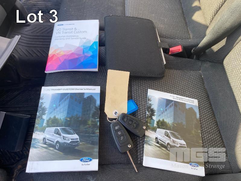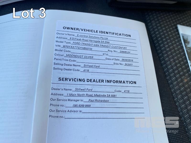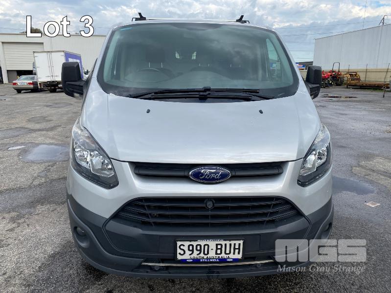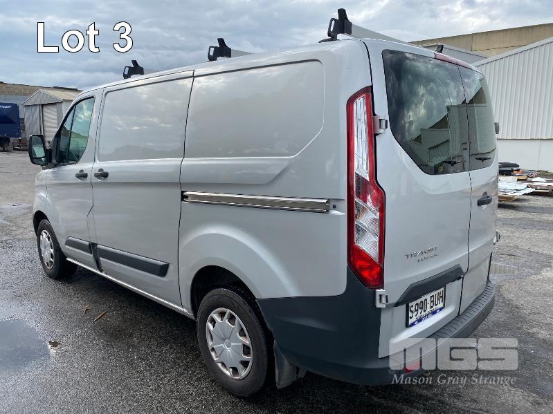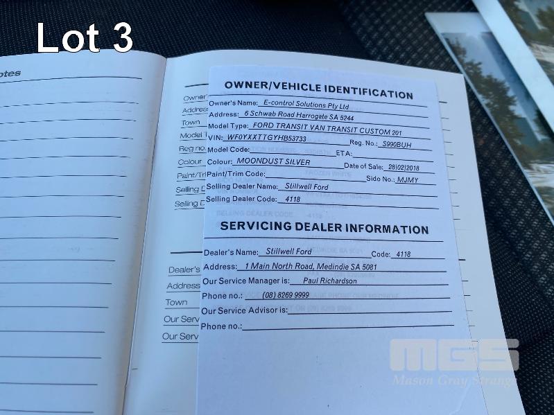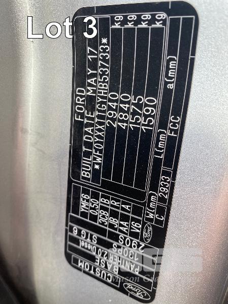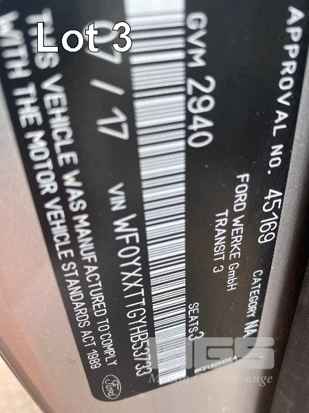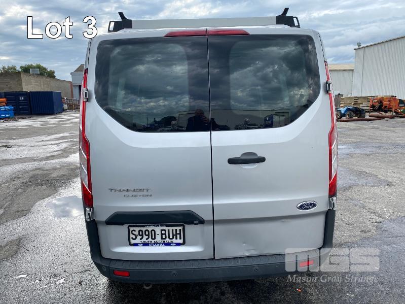 2017 FORD TRANSIT 3, CUSTOM 201, 290S VAN REG: S990 BUH (SA) VIN: WF0YXXTTGYHB53733 ENG: YMF6HB53733 ODO: 109,634kms SHOWING 2.0 LITRE TURBO DIESEL, 6 SPEED MANUAL TRANSMISSION, SILVER DUCO, 2 DOORS, 3 SEAT, ABS, AIR BAG, AIR CON, CD PLAYER, CENTRAL LOCKING, CRUISE CONTROL, DECALS, IMMOBILISER, POWER STEERING, POWER WINDOWS, ROOF RACKS, SPARE WHEEL, REVERSE CAMERA GVM: 2,940kg KEY #8 (WITH PAPERS, WITH 2 KEY/S, WITH OWNER'S MANUAL, WITH SERVICE BOOKS) CONDITION: PANEL NEAR FUEL - HATCH BROKEN OFF ROOF - DENTS & SCRATCHES REAR DOOR - DENTS