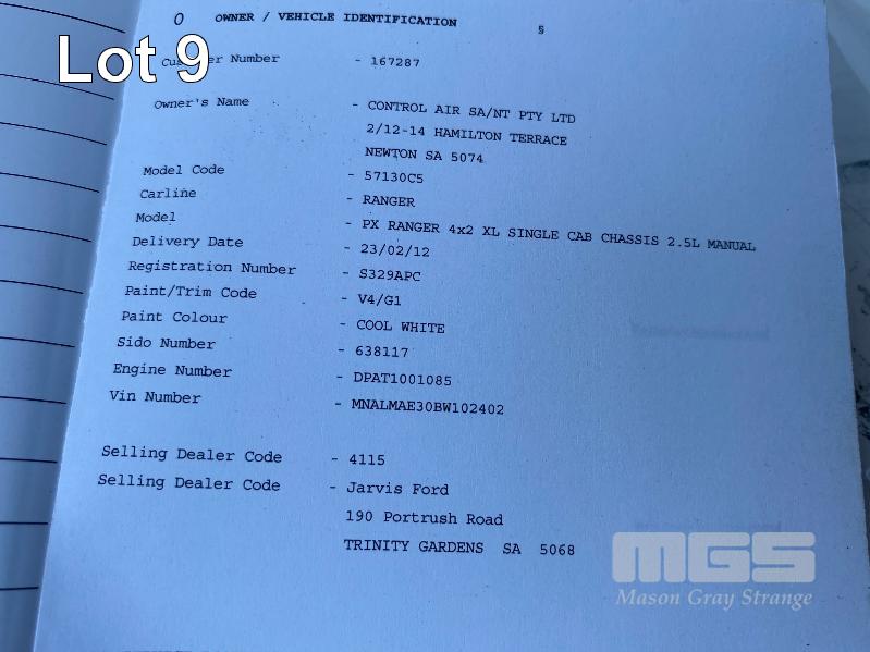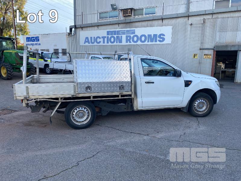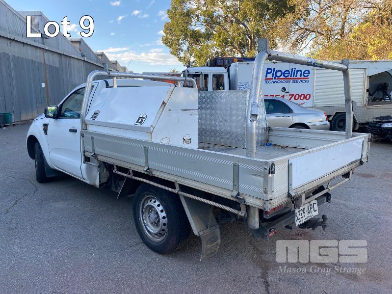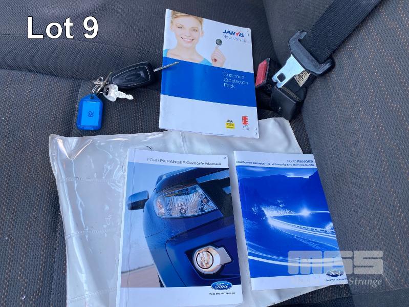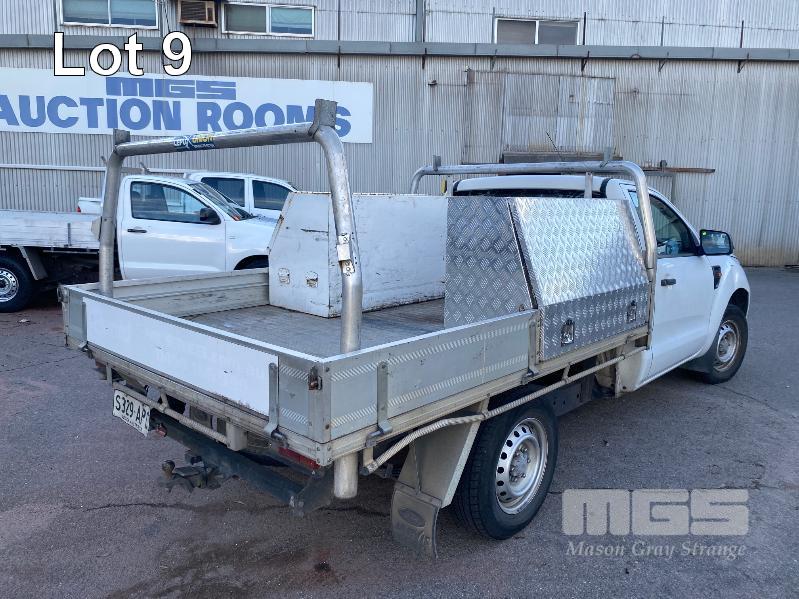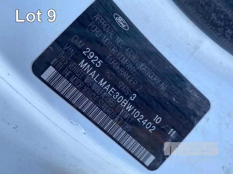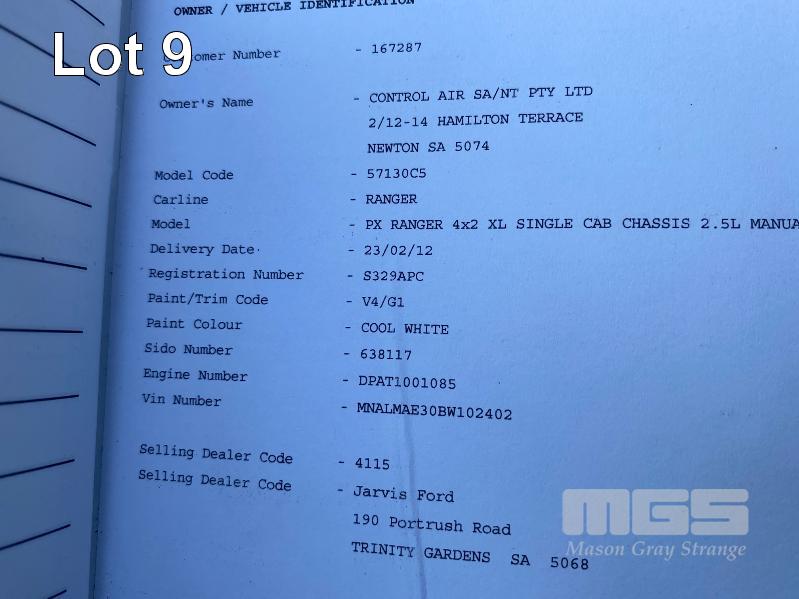 2011 FORD RANGER 2 PX SINGLE CAB TRAY TOP UTILITY REG: S329 APC VIN: MNALMAE30BW102402 ENG: DPAT1001085 ODO: 222, 917 kms INDICATED 2.5 LTR EFI, 5 SPEED MANUAL, WHITE DUCO, 2 DOORS, 2 SEAT, ABS, AIR BAG, AIR CON, BLUETOOTH, CD PLAYER, CENTRAL LOCKING, CRUISE CONTROL, IMMOBILISER, POWER STEERING, POWER WINDOWS, SPARE WHEEL, TOW BAR, 2 x TRAY MOUNT TOOL BOXES ALLOY LADDER RACK KEY #62 (NO PAPERS, WITH 1 KEY/S, WITH OWNER'S MANUAL, WITH SERVICE BOOKS) CONDITION: FRONT LH GUARD - MINOR IMPACT DAMAGE