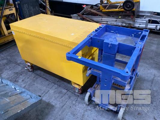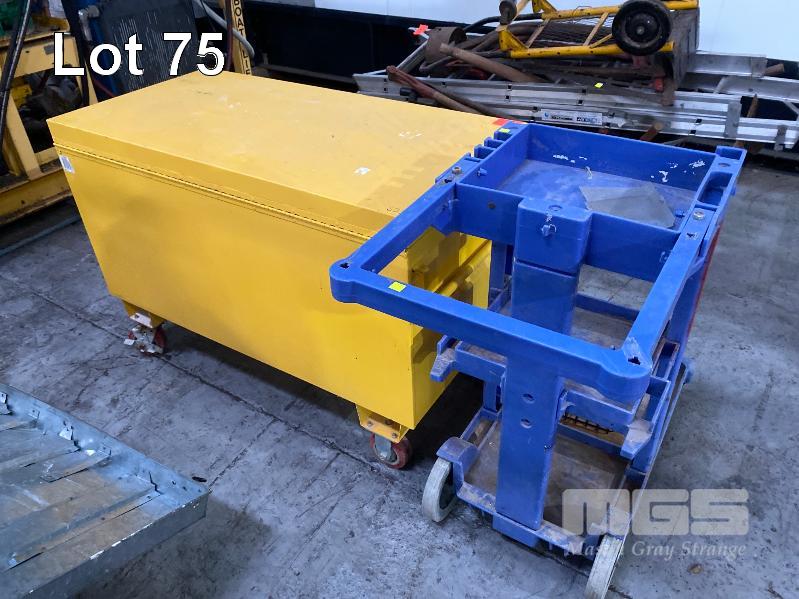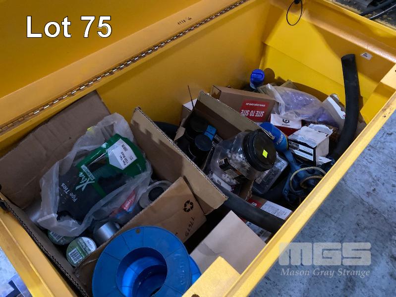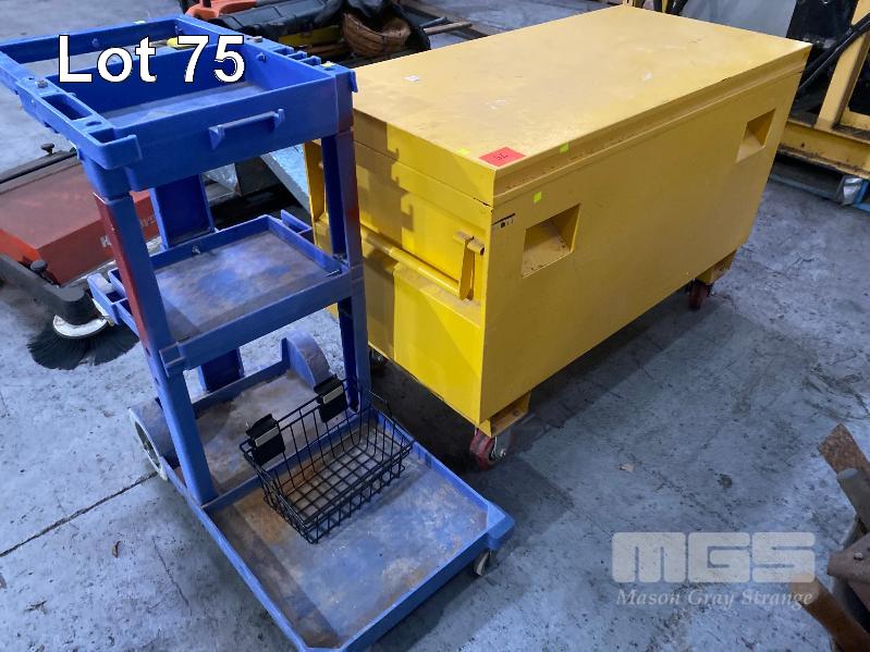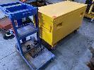 BUILDERS SITE BOX, YELLOW STEEL, MOBILE, LOCKABLE 1220 x 610 x 860mm (H), BUILDERS TROLLEY, 3 TIER, BLUE POLY & QUANTITY NUTS, BOLTS, CABLE, TAPE, PAINT, ETC
