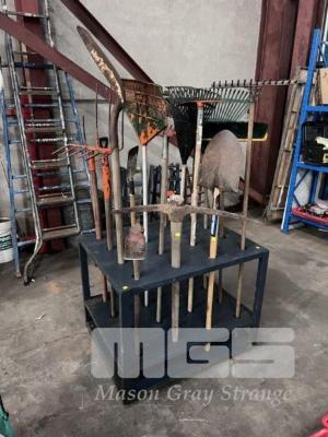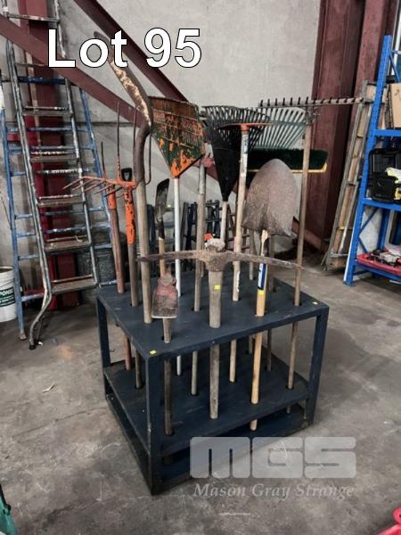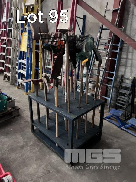 GARDEN TOOL STAND, 900 x 700 x 700mm WITH ASSORTED GARDEN TOOLS, SHOVELS, RAKES, ETC