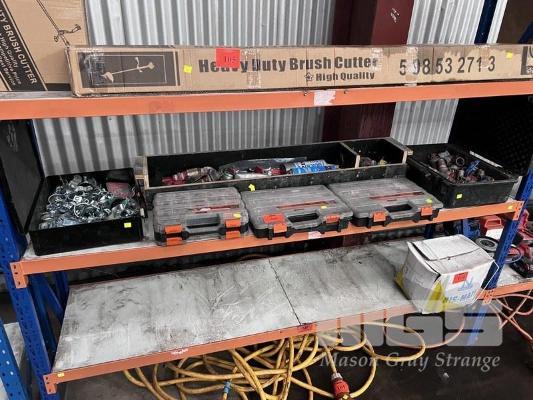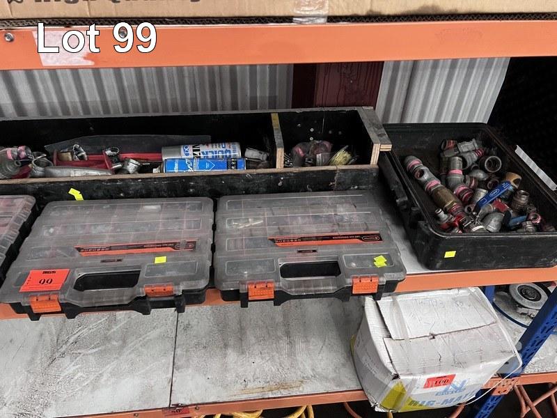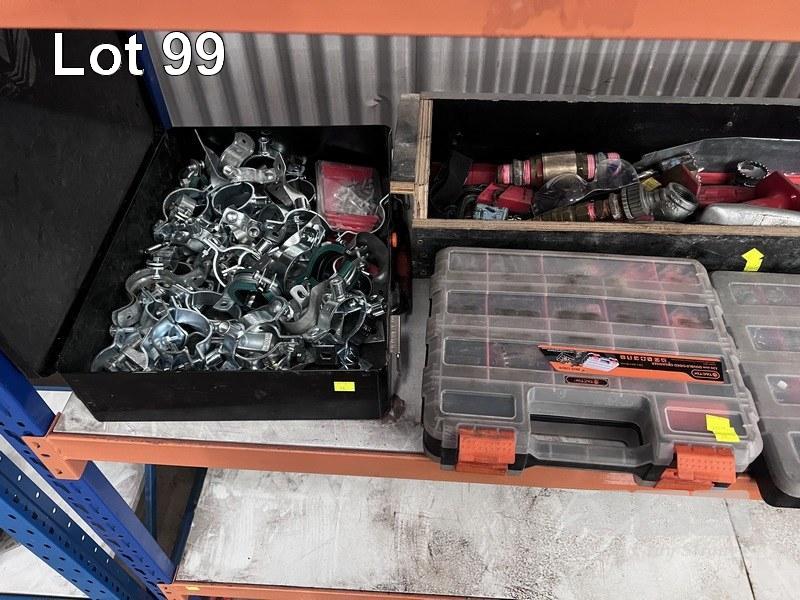3 x GRAB KITS OF ASSORTED SPRINKLER HEADS, NUTS, BOLTS, ETC, 2 x BOXES PIPE FITTINGS & CLAMPS, ETC 1 x SHELF