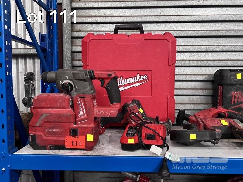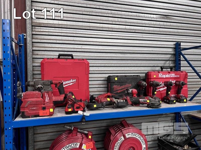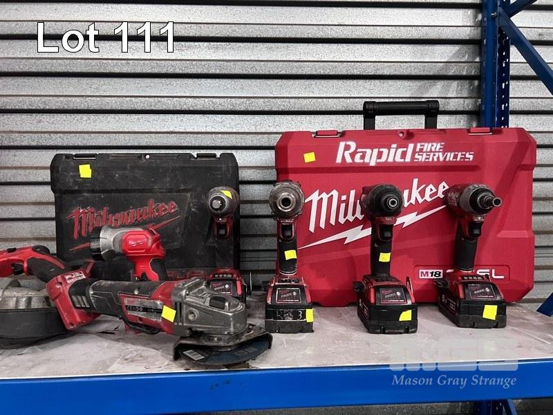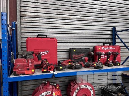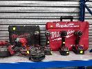 MILWAUKEE CORDLESS TOOLS INC IMPACT GUN, ANGLE GRINDER, RECIPRO SAW, BAND SAW, DRILL, 2 x TEK GUNS, HAMMER DRILL & LIGHT WITH 1 x CHARGER & 4 x BATTERIES