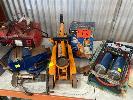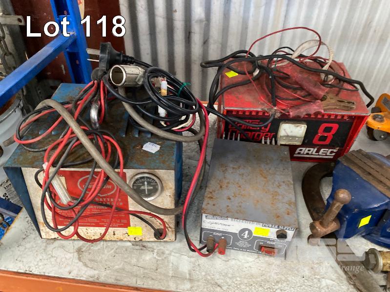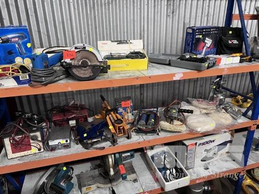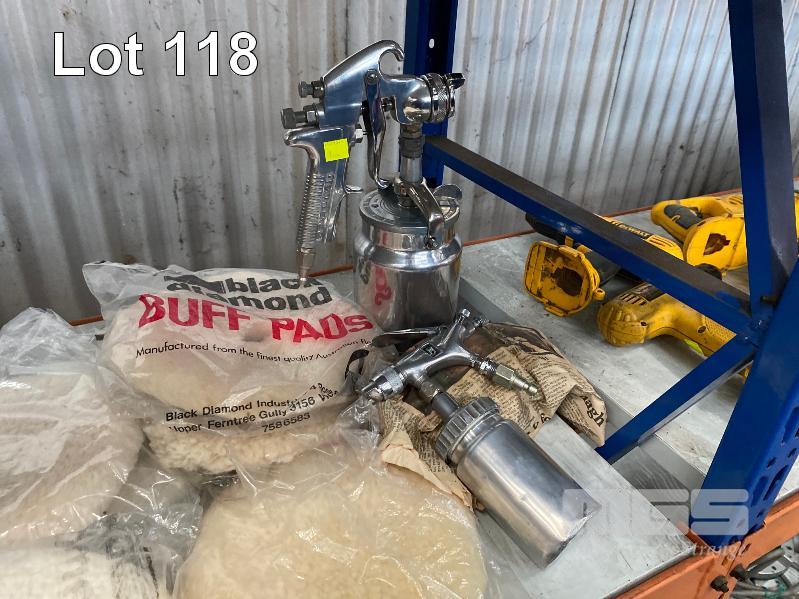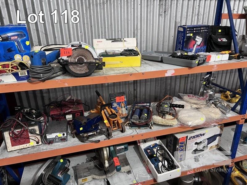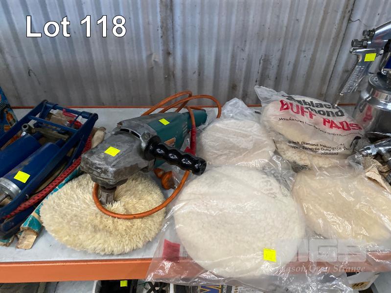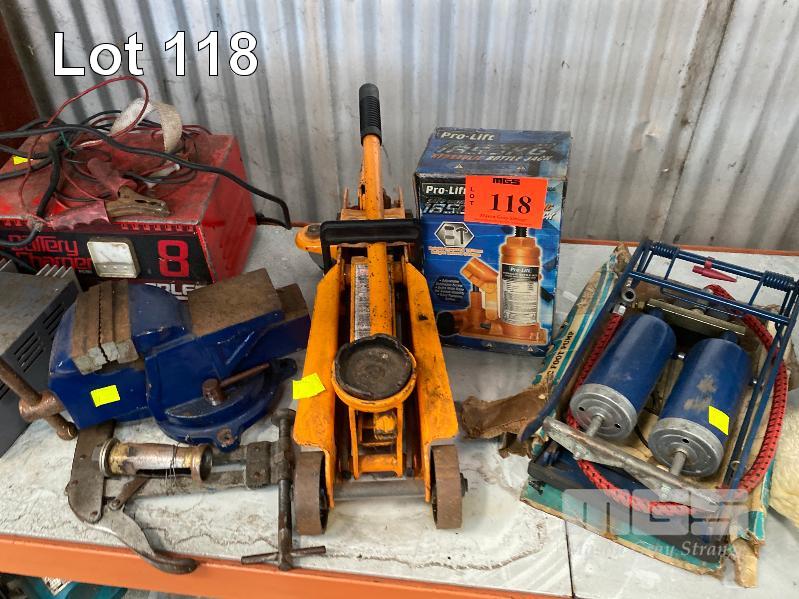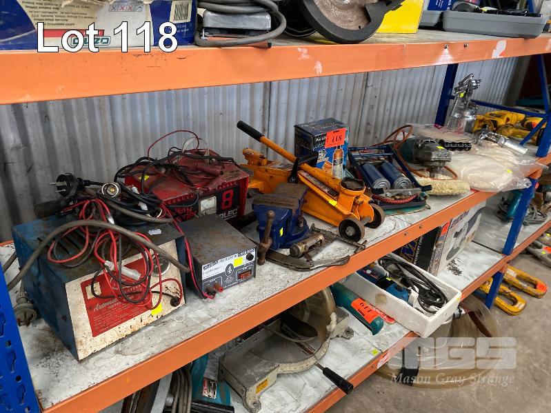 B&D HAND BUFF WITH ASSORTED HAND BUFFS, 2 x SPRAY PAINT GUNS, DEVILBISS, TROLLEY JACK, BOTTLE JACK, 100mm VICE, 3 x BATTERY CHARGERS, ETC 1 x SHELF