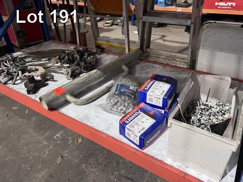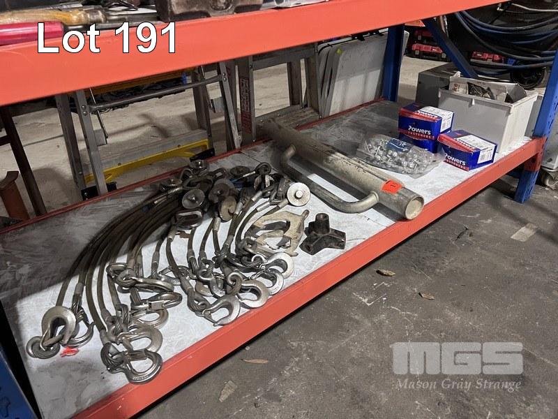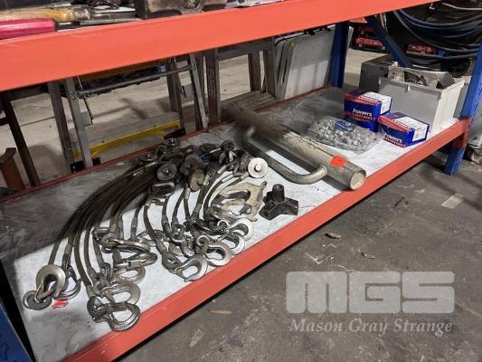 POST DRIVER, GALV STEEL, POWERS FASTENERS, TEK SCREWS, HOOK CLAMPS WITH WIRE ROPE, ETC (1 X SHELF)