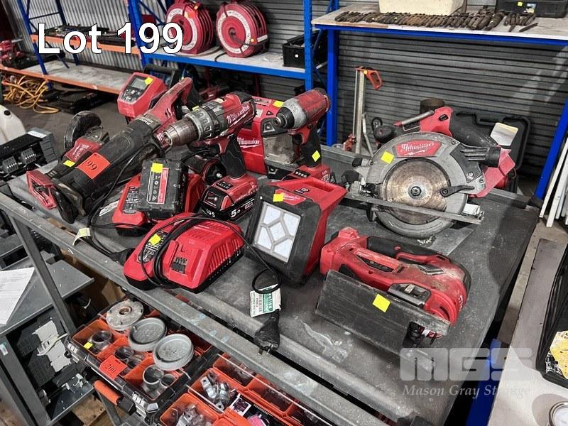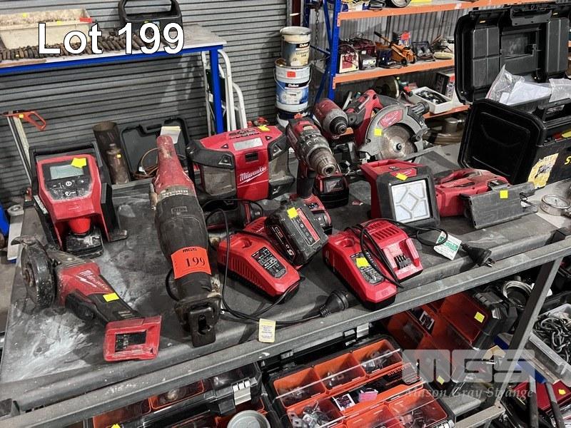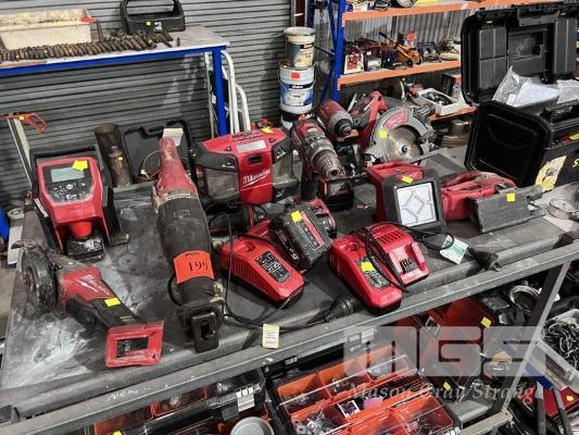 MILWAUKEE CORDLESS TOOLS INC ANGLE GRINDER, RECIPRO SAW, LASER LEVEL, RADIO DRILL, TEK GUN, CIRCULAR SAW & JIGSAW WITH 2 x CHARGERS & 4 x BATTERIES
