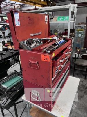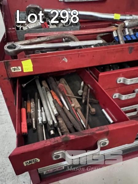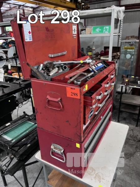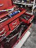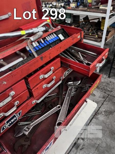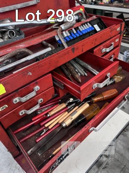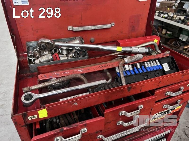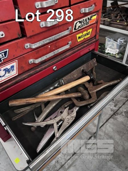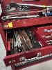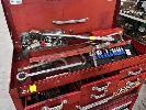 TOOL CHEST, RED STEEL, 10 DRAWER & CONTENTS ASSORTED HAND TOOLS INC SOCKET SETS, SHIFTERS, PUNCHES, CHISELS, VICE GRIPS, HAMMERS, ETC, ON TROLLEY