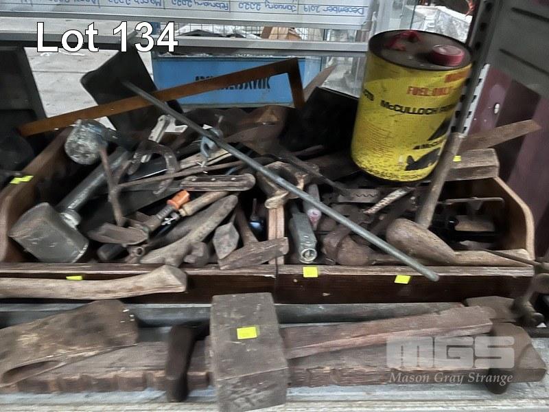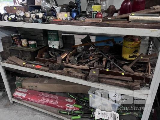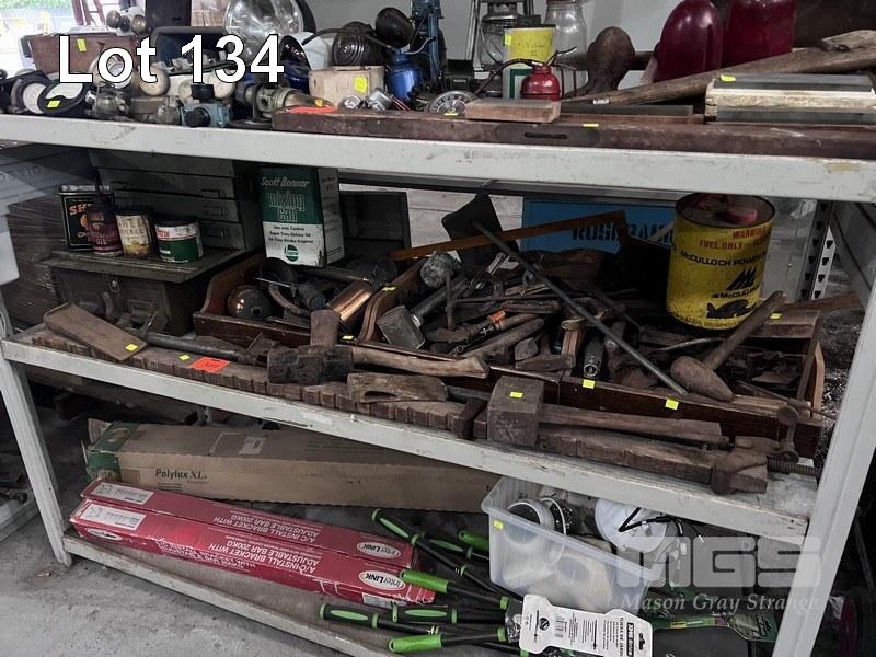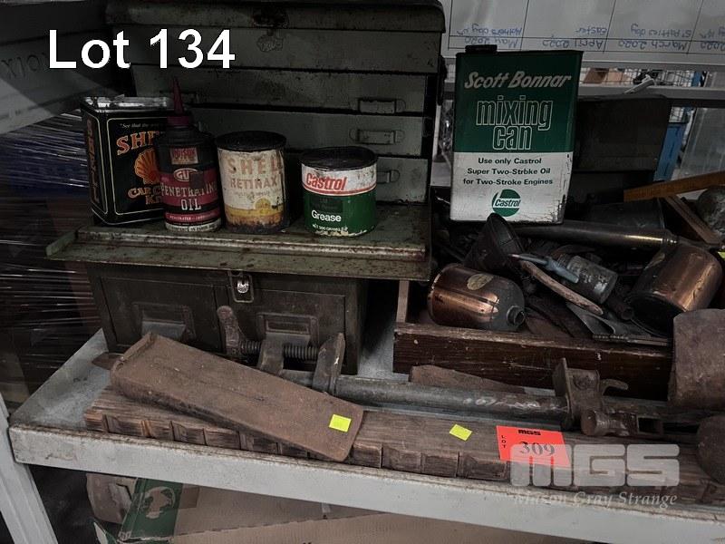 VINTAGE HAND TOOLS INC SASH CLAMPS, MALLETS, JAW TRAPS, SPRAY PUMPS, OIL CANS, TOOL BOXES, ETC 1 x SHELF