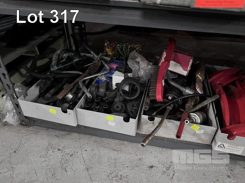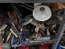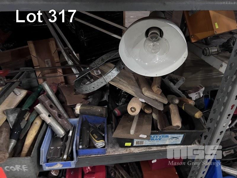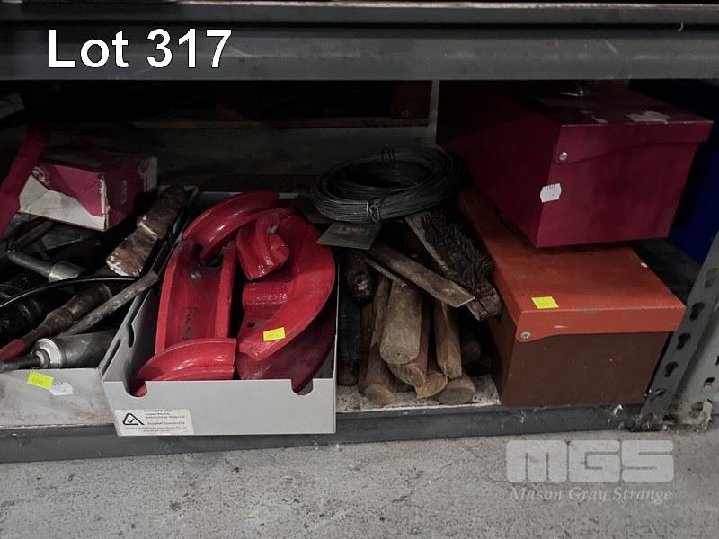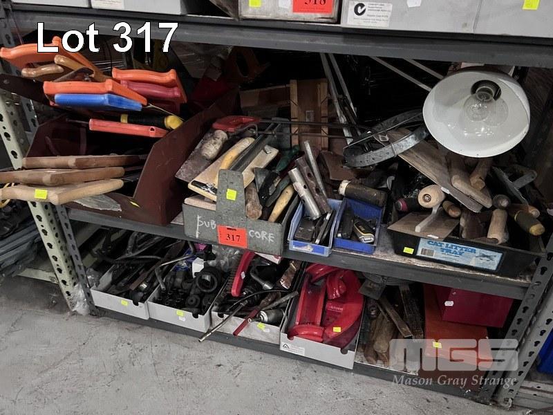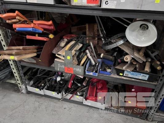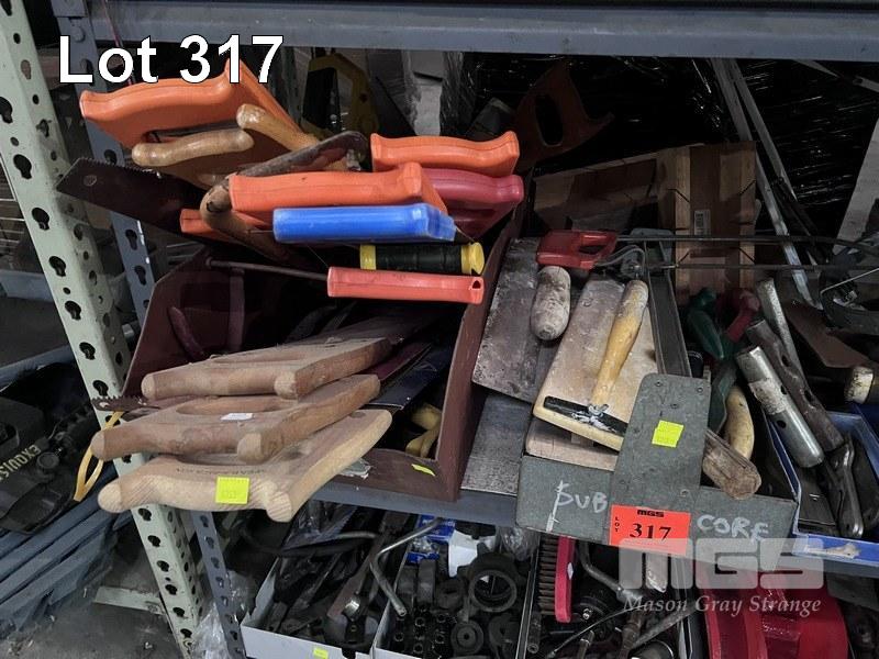 QUANTITY HAND TOOLS, INC SAWS, HAMMERS, CONCRETE FINISHING TOOLS, GREASE GUNS, PIPE BENDING DIES, TOOL BOXES, ETC 2 x SHELVES