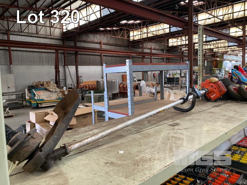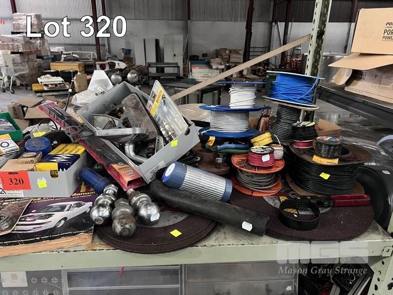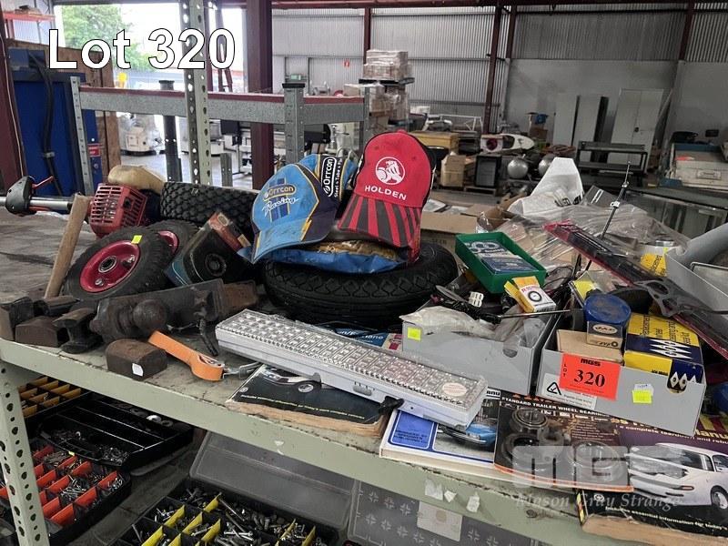 RYOBI BLOWER VAC, 240V, MECHO LINE TRIMMER, PETROL, AUTO ELECTRICAL & MECHANICAL PARTS IN CROLL ELEC WIRE, FUSES, BEARINGS, TOW BALLS, CUT OFF DISCS, WHEELS, ETC 2 x SHELVES