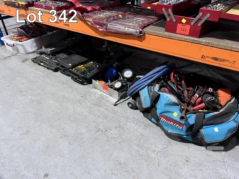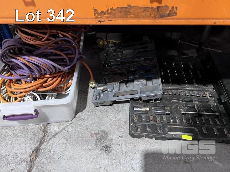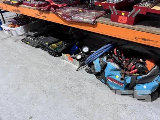 ASSORTED TOOLS, SOCKETS, 4 x SIDCHROME & STANLEY SCREWDRIVER SETS, GREASE GUN, BATTERY CHARGER, TOOL BAGS, EXTENSION CORDS, TYRE GAUGES, ETC
