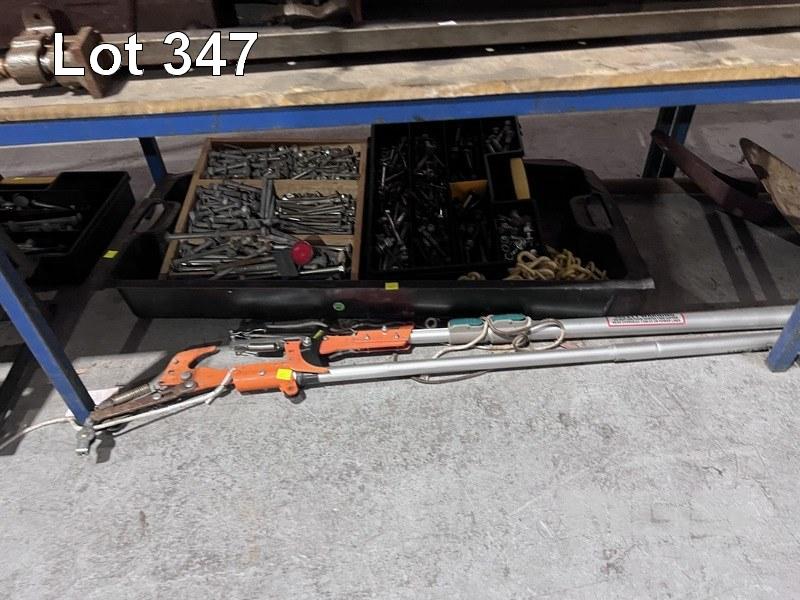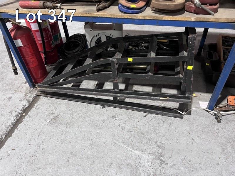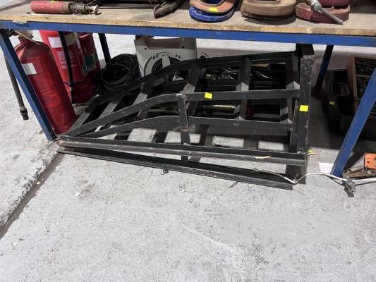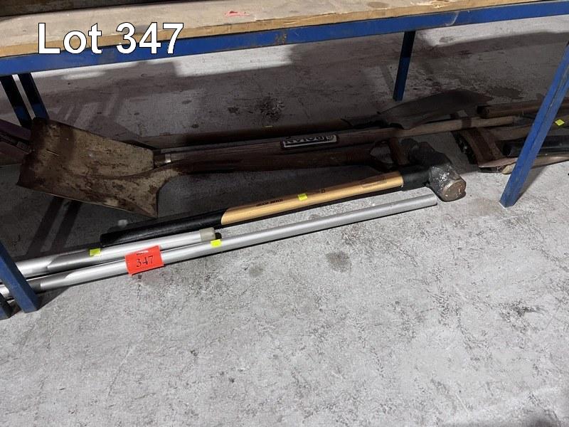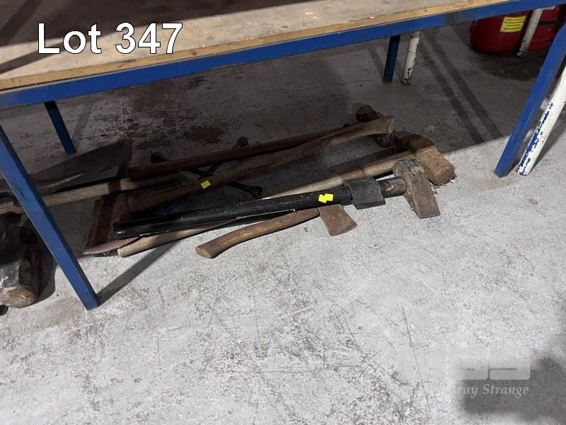 PAIR CAR RAMPS, SHOVELS, SLEDGE HAMMER, AXES, 2 x FIRE EXTINGUISHERS, NUTS & BOLTS, ETC