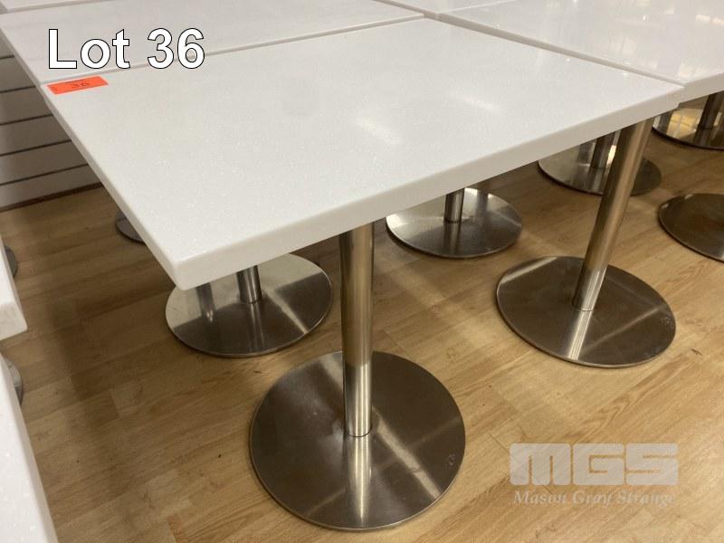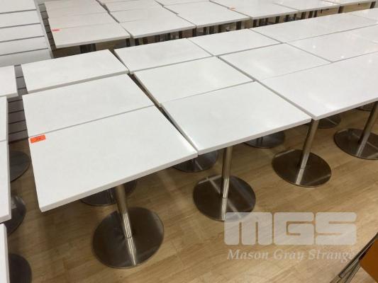 12 x CAFE TABLES, 700 x 520mm, WHITE ACRYLIC TOP, CHROME PEDESTAL BASE