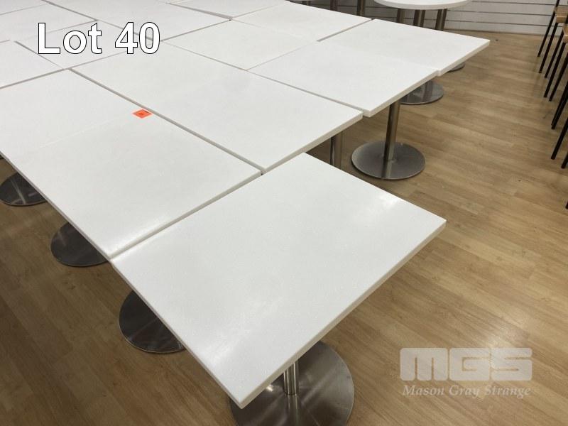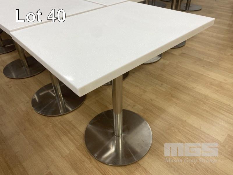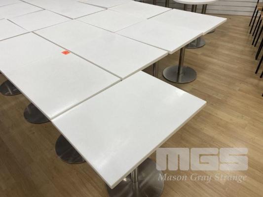 5 x CAFE TABLES, 700 x 520mm, WHITE ACRYLIC TOP, CHROME PEDESTAL BASE