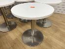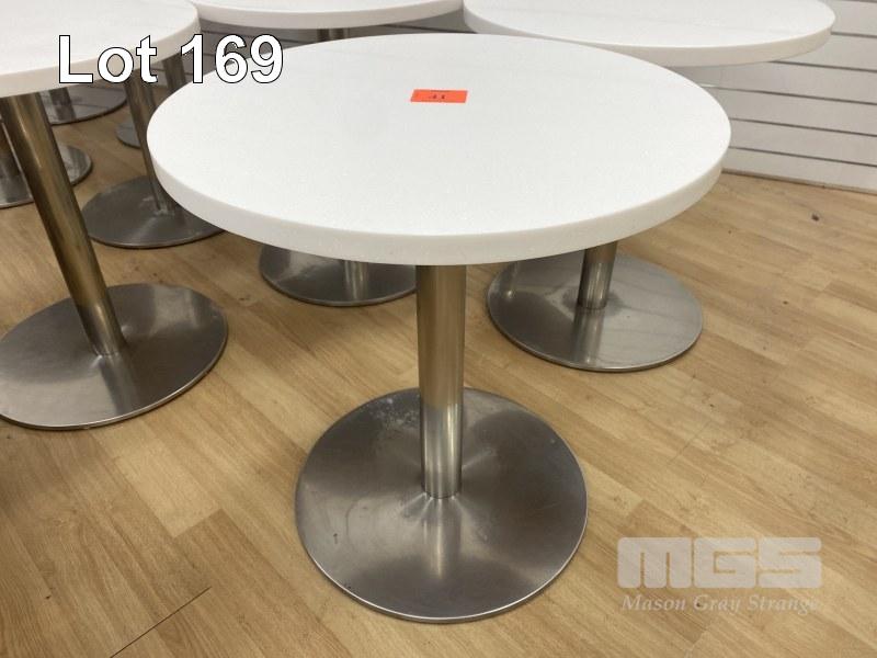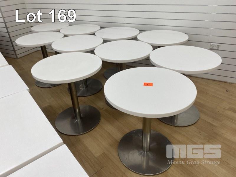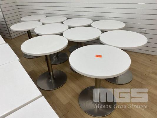 10 x CIRCULAR CAFE TABLES, 700mm (D), WHITE ACRYLIC TOP, CHROME PEDESTAL BASE,